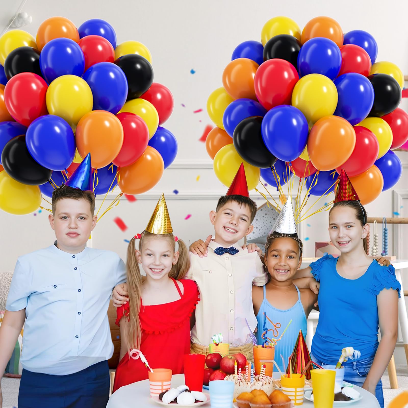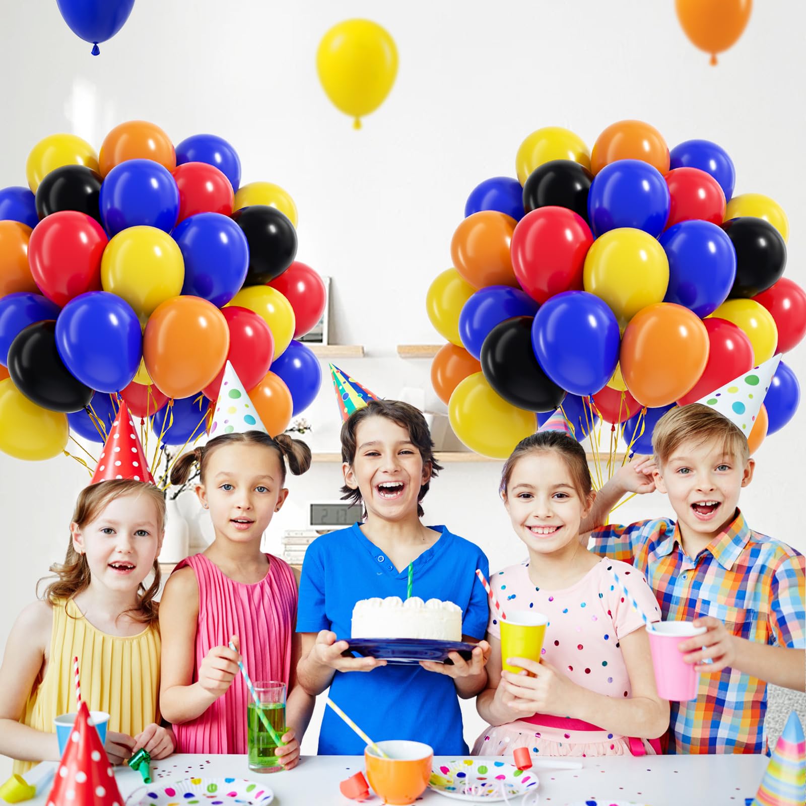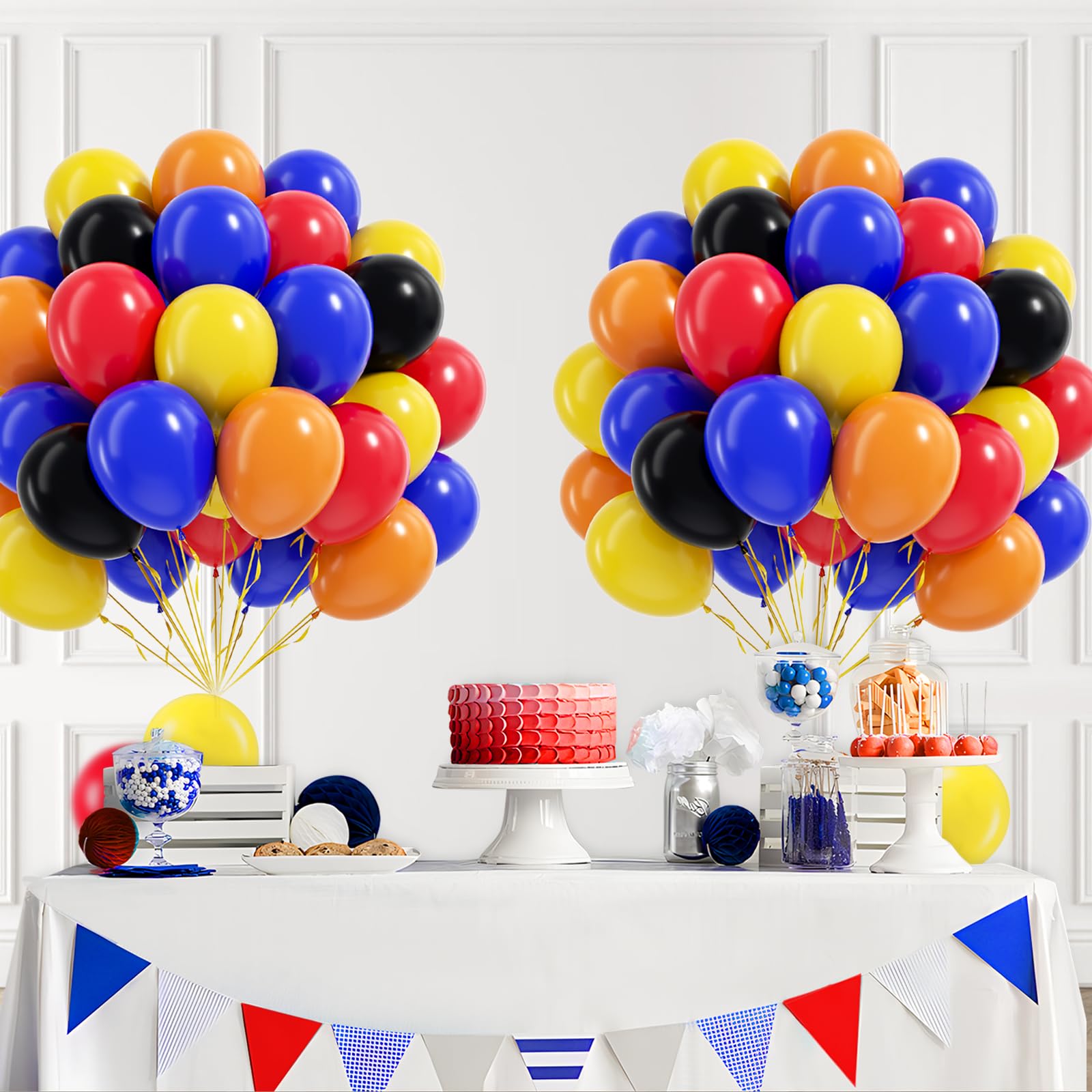 Package Include:The race car balloons include 12inch black balloonsx15, 12inch royal blue balloonsx15, 12inch yellow balloonsx10, 12inch red balloonsx10, 12inch orange balloonsx10, glue dotsx20, yellow ribbonx1