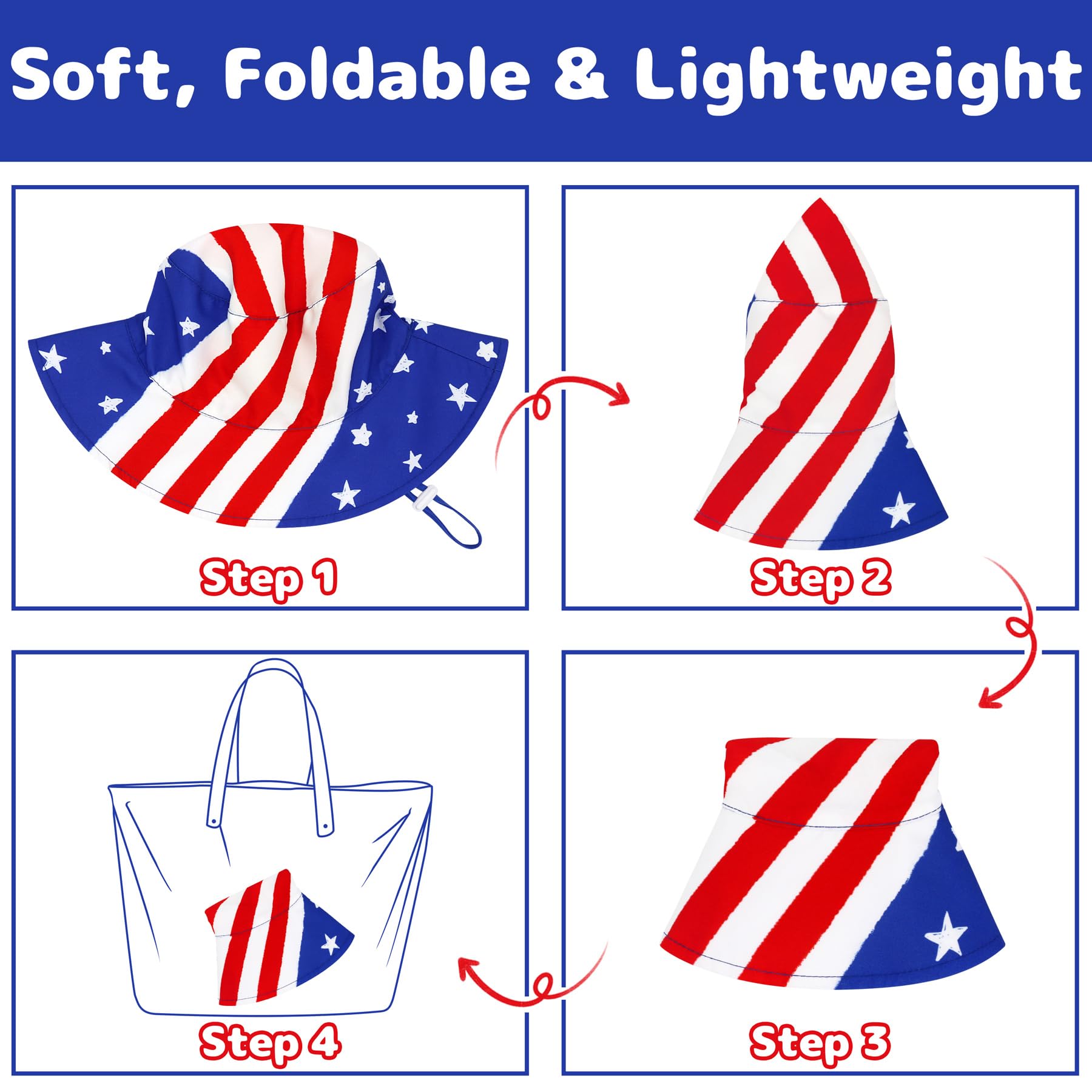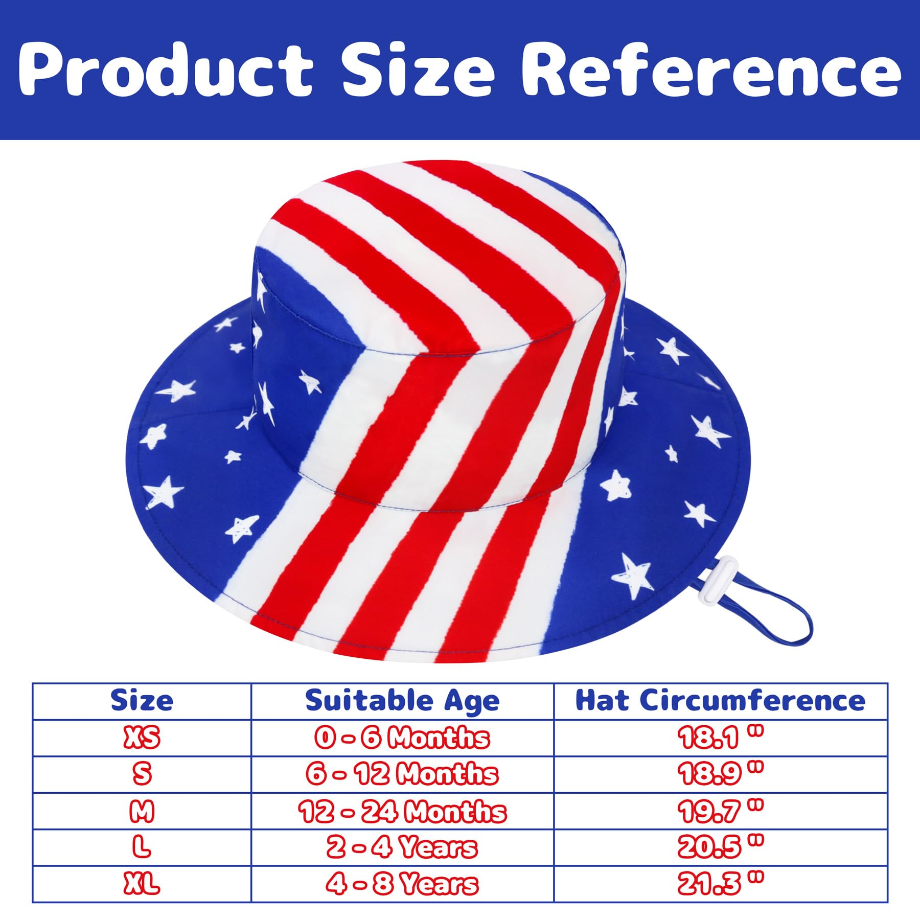 ADJUSTABLE & LIGHTWEIGHT: Our baby sun hat features an adjustable chin strap that helps to fix well on baby's head and protect the USA hat from being blown away on windy days. And the chin strap is detachable, so it can be easily removed when you don't need it. This special design guarantees more security and comfort in outdoor activities. Besides, our toddler boy sun hat and toddler girl sun hat are so lightweight that it's easy to fold and carry around. What a wonderful toddler swim hat!