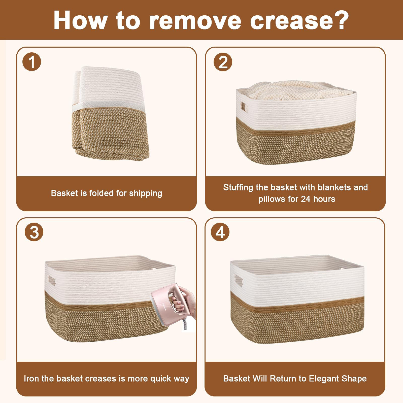 Washable Large Basket: This large basket can be washed by hand or machine with gentle detergent. If machine washed, please put them into a laundry bag. NOTE: These cotton rope baskets are folded when shipping, but it will turn back to its elegant shape quickly if you fill it with some towels or clothing, and iron is great idea to remove the creases