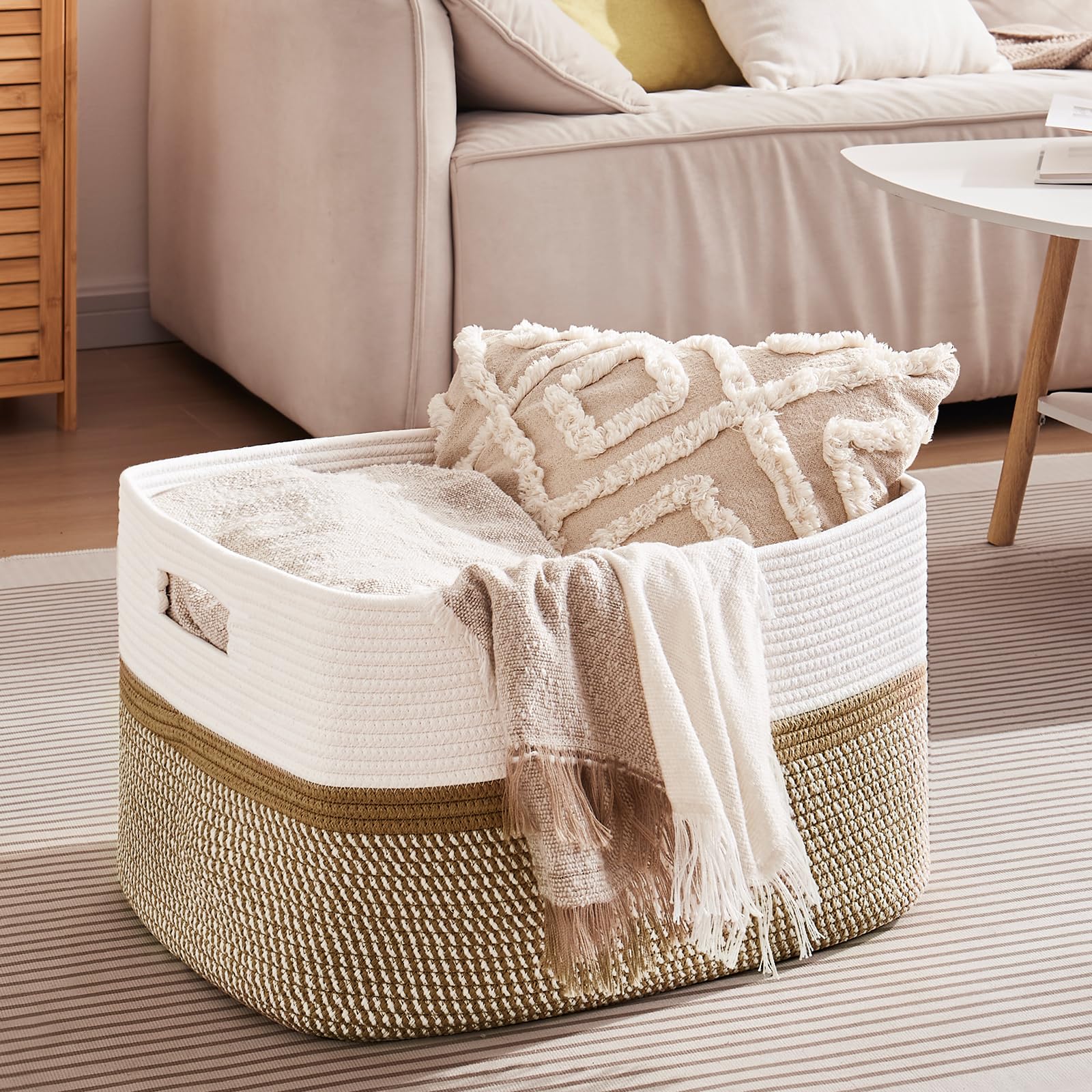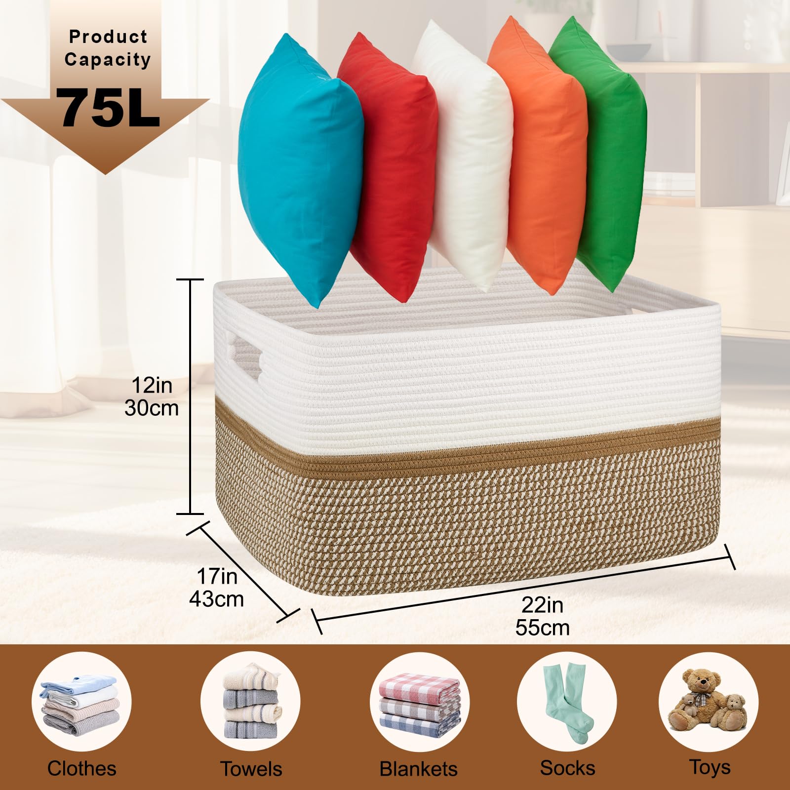 Decorative Blanket Storage for Living Room:This rectangular blanket basket is more stable and easier to restore its sahpe after you receive the package. The 22’’ x 17’’ x 12’’ large storage basket can also used to store blankets, pillows, cushions, toys, clothes and towels