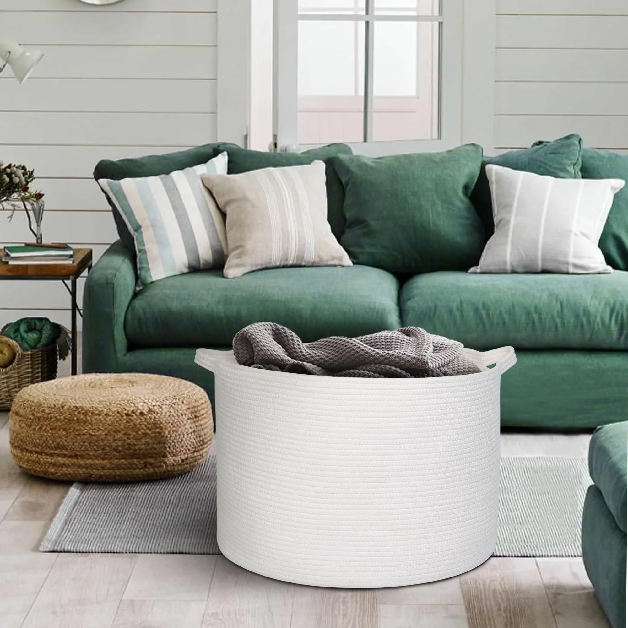 SOFT WHITE COTTON ROPE BASKET: The white basket is braided from natural cotton rope, making it a super soft but sturdy, textured bin. The rope basket for storage is huge and doesn't have a smell at all. Woven rope baskets with no hard edges are safe for your kids allowing them to climb into these wick basket and won't scratches or damage the floors.