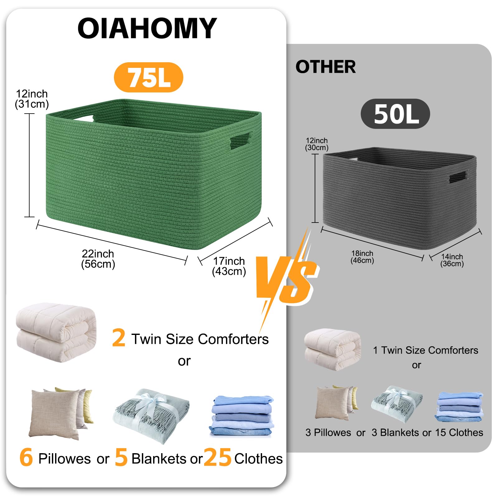 Large size Blanket Basket:22”x17”x12”, which perfect for throw pillows,cushions,blankets, comforter,toys and clothes.Keep in the kids room, family room, or any room in the house that could use extra storage: fits on a closet shelf, beside the sofa or bed