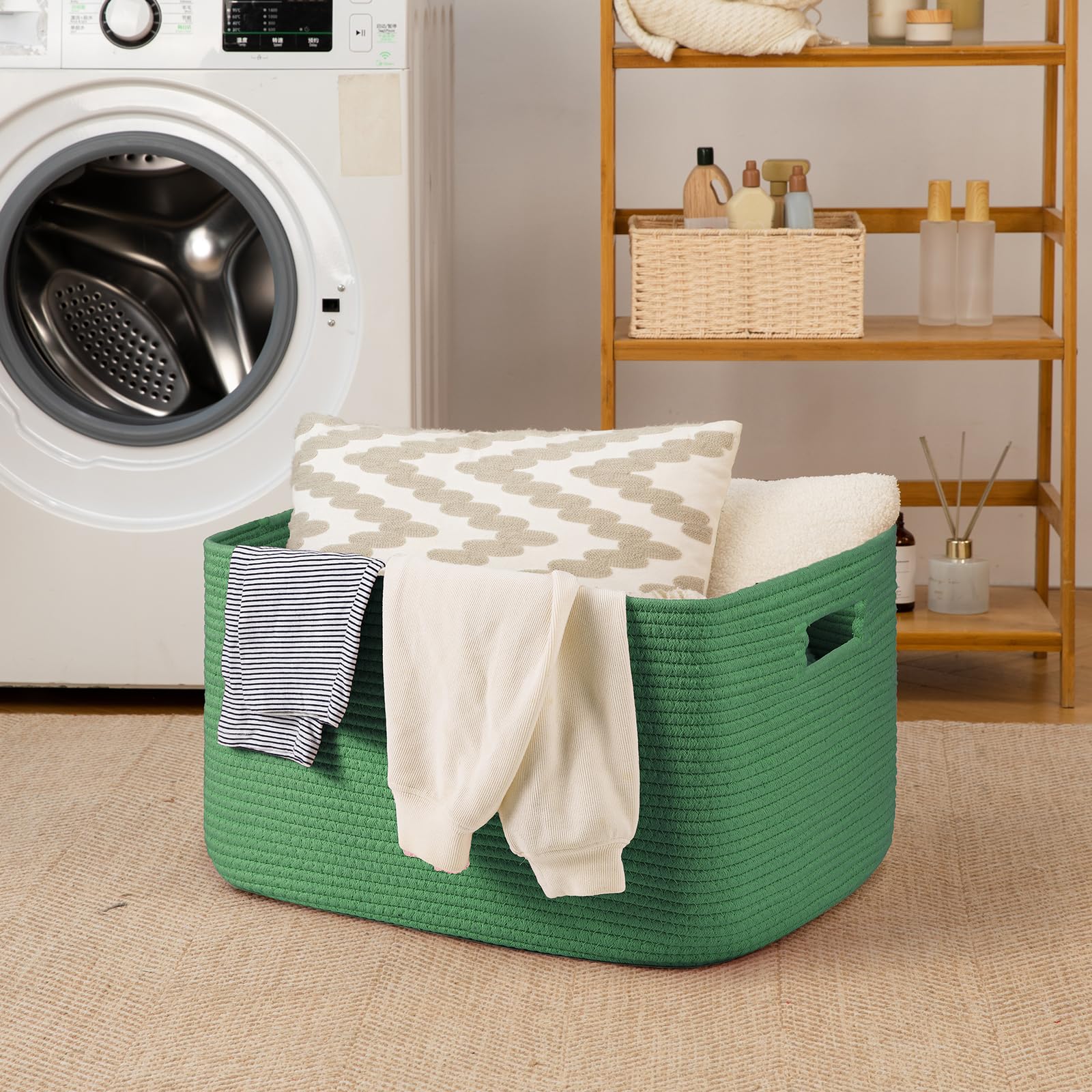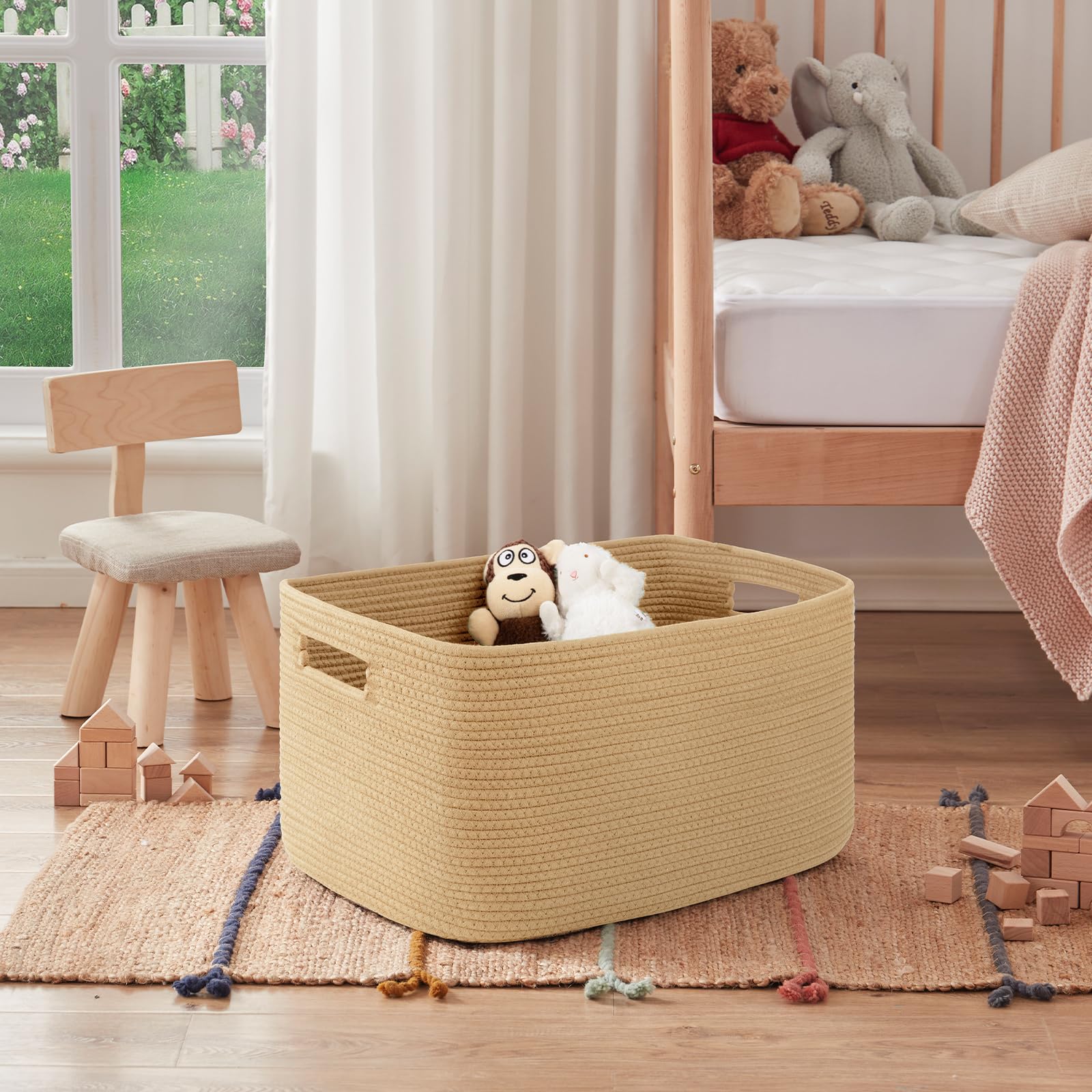 Double reinforced Handles:We use the highest grade cotton rope as raw material and all the stitches are distribution and fine,which makes the toy baskets better wear resistance and durability to be used for many years.In addition, the handle of this large basket has a unique design and is wrapped around with thick double-layer suture rope to prevent tearing and keep its shape and never fall off