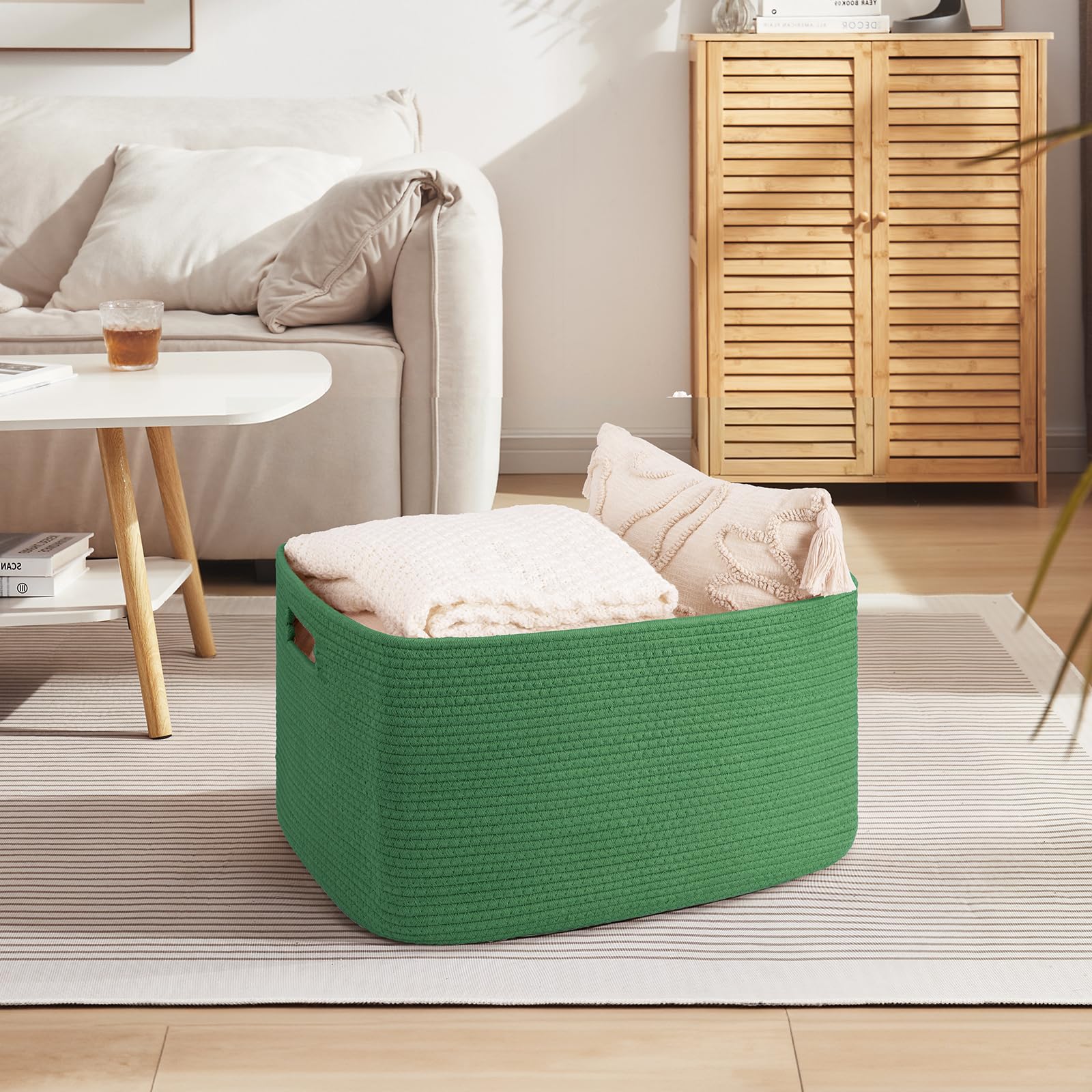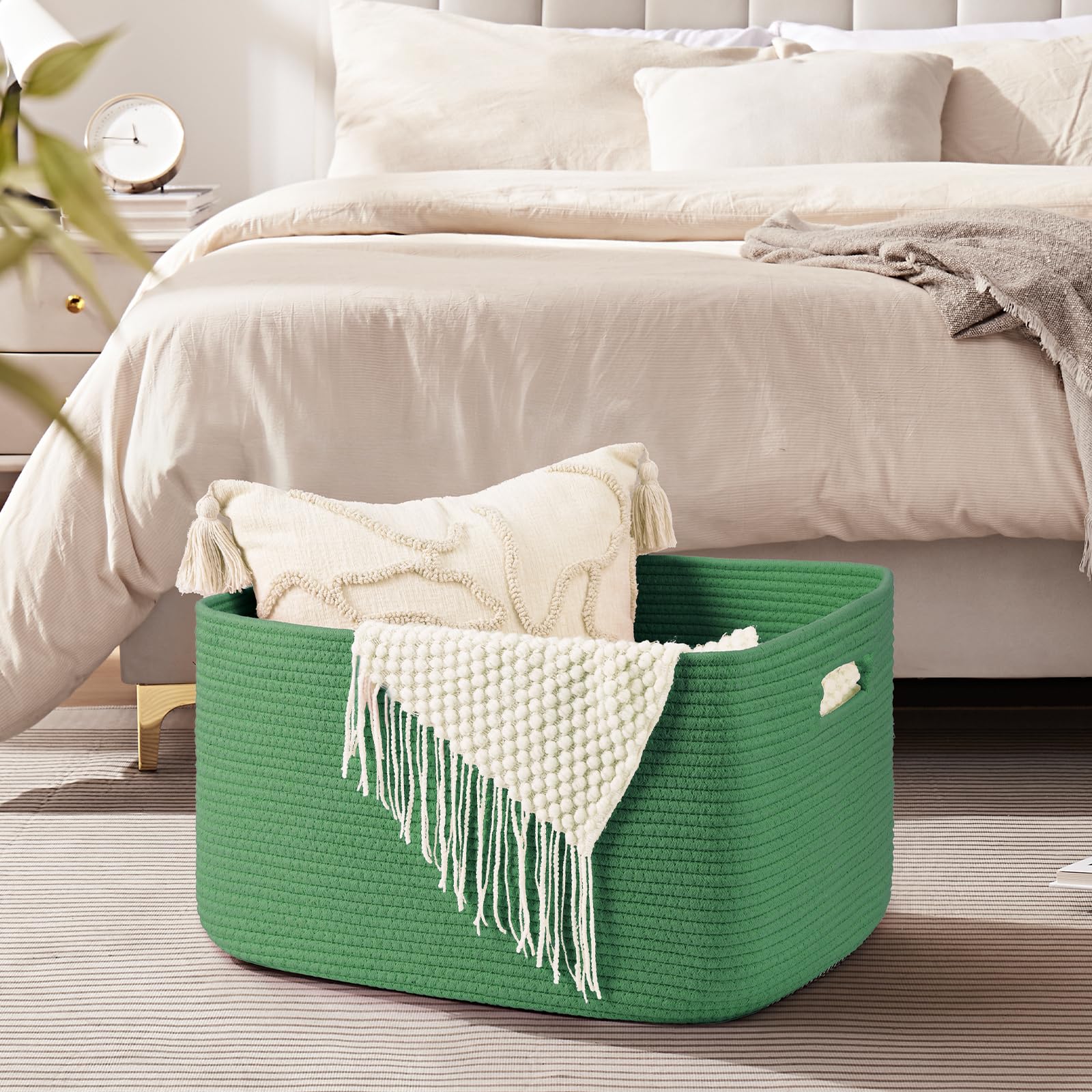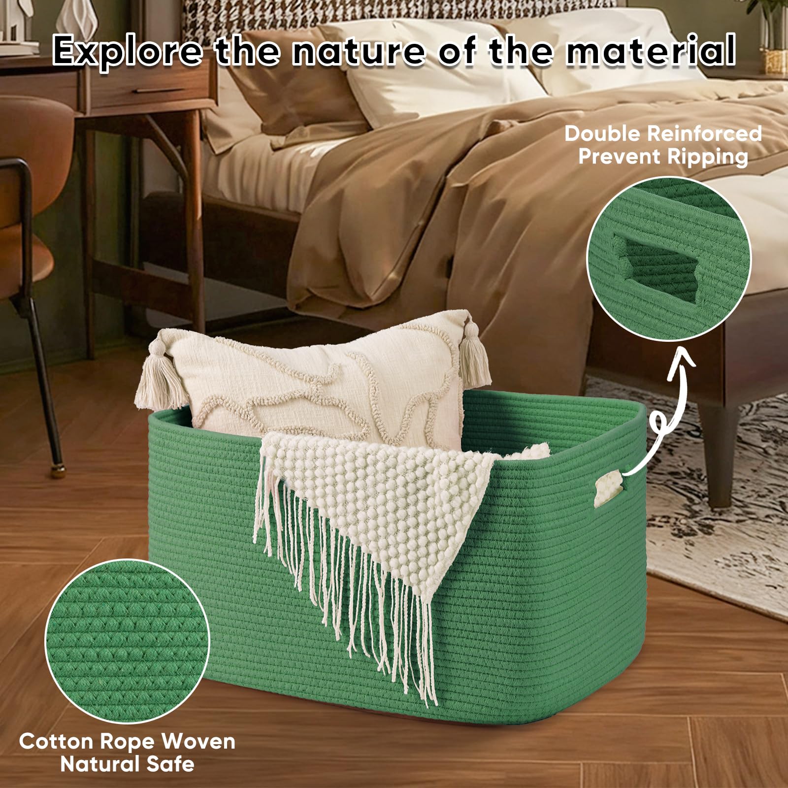 Natural Cotton rope basket:OIAHOMY high quality dirty clothes basket is made of cotton Rope, No Chemical No Nasty No Disgusting Smell,Safe for Intimate Clothing.In addition,this blanket storage is no sharp edges and a hard surface, safe for kids, elders,pets