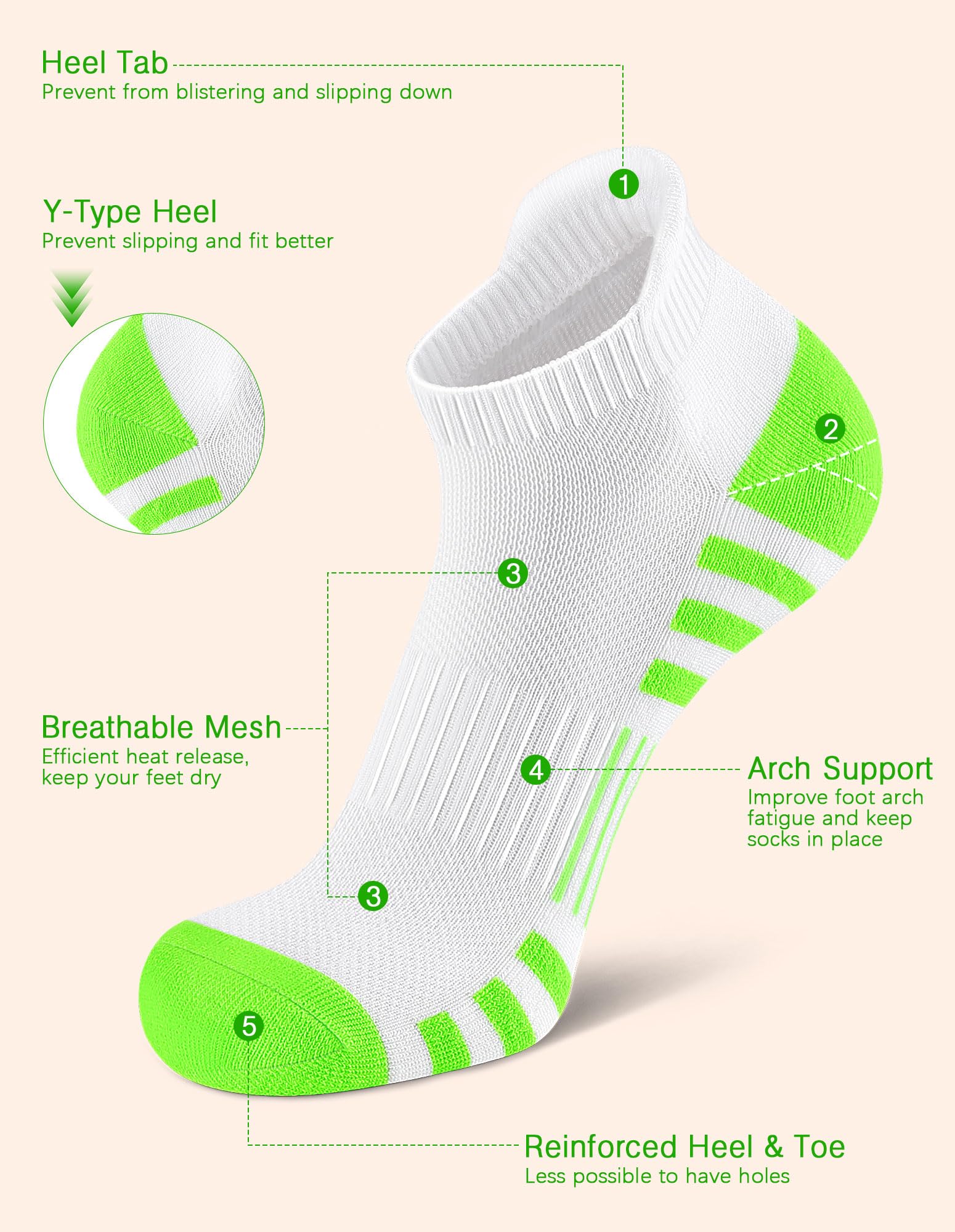 Non Slip Off & Arch Support - Our low cut tab socks have suitable compression in arch to protect you when you walk, jog and run and increase stability for a perfect fit. Elastic cuff tab can lock the heel and make sure our sports socks non-slip in order to avoid athletic sock sliding from your daily walking, running, cycling, hiking, tennis, soccer.