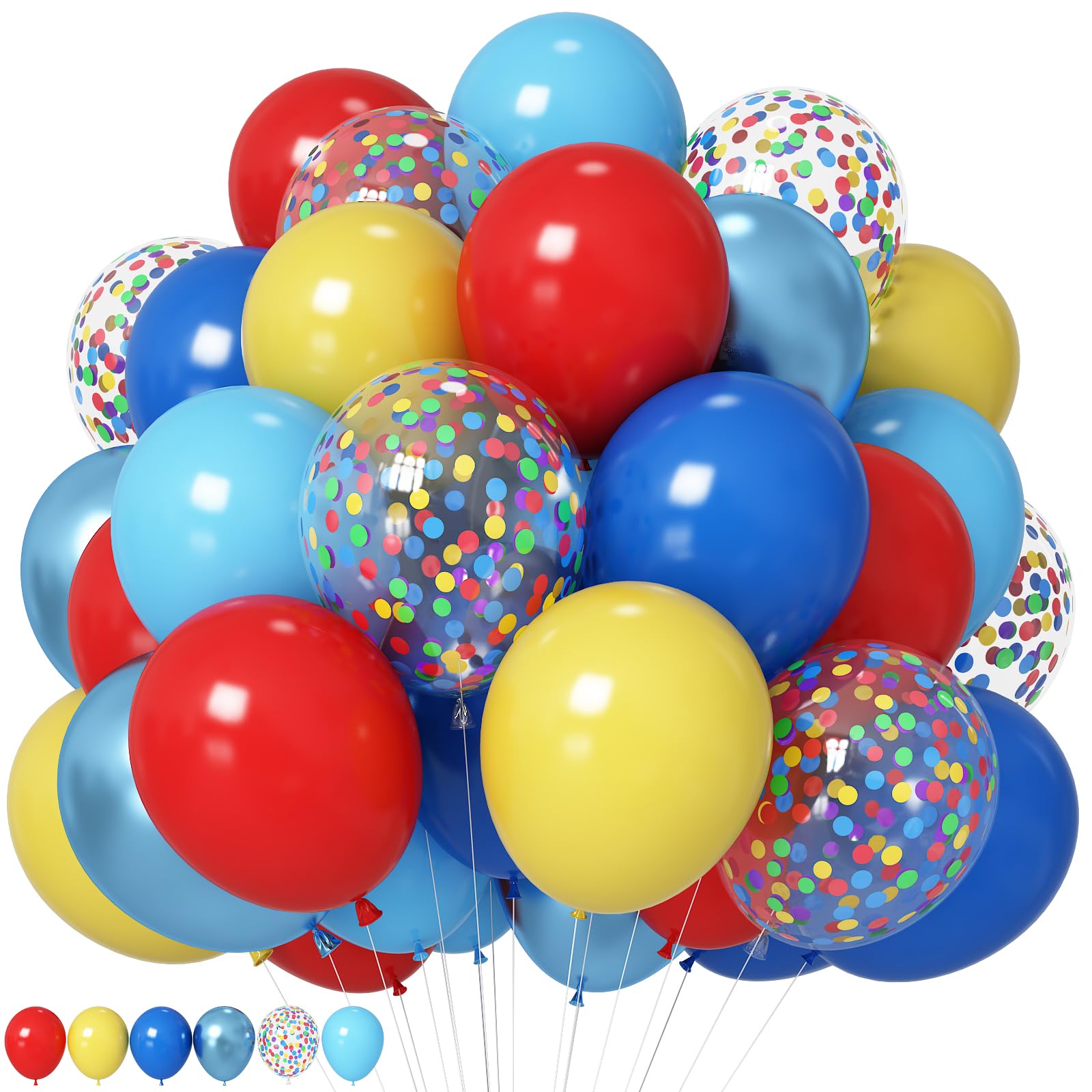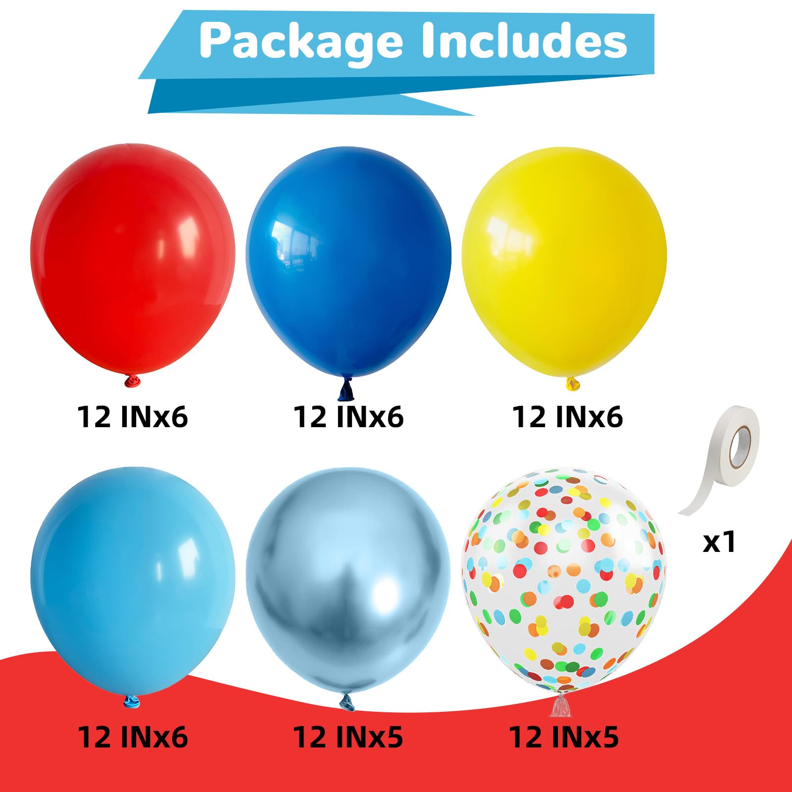 Circus Balloons: Includes red balloons (12 inch; 6 pcs ); dark blue helium balloon (12 in; 6 pcs ); yellow balloons (12 in; 6 pcs ); pastel blue balloons (12 in; 6 pcs ); blue metallic balloons (12 in; 5 pcs ); color confetti balloon(12 in; 5 pcs ) and a roll white ribbon