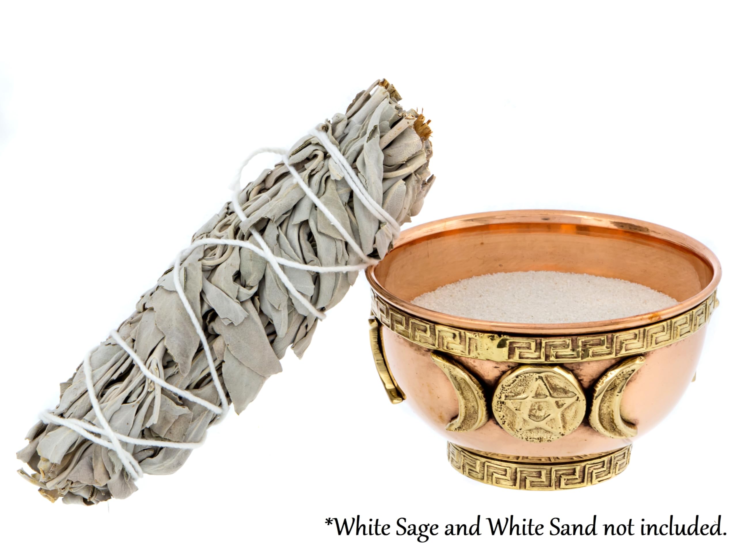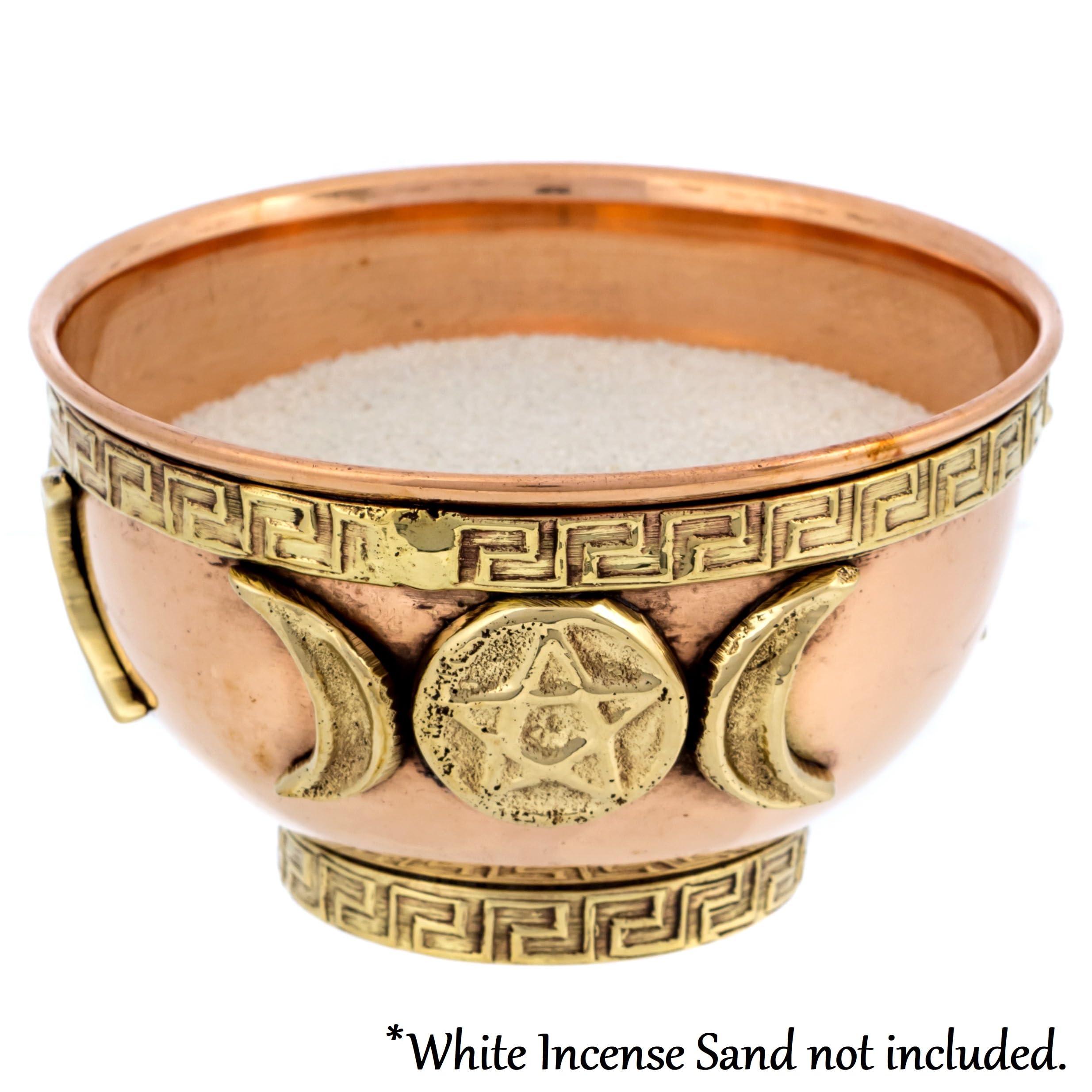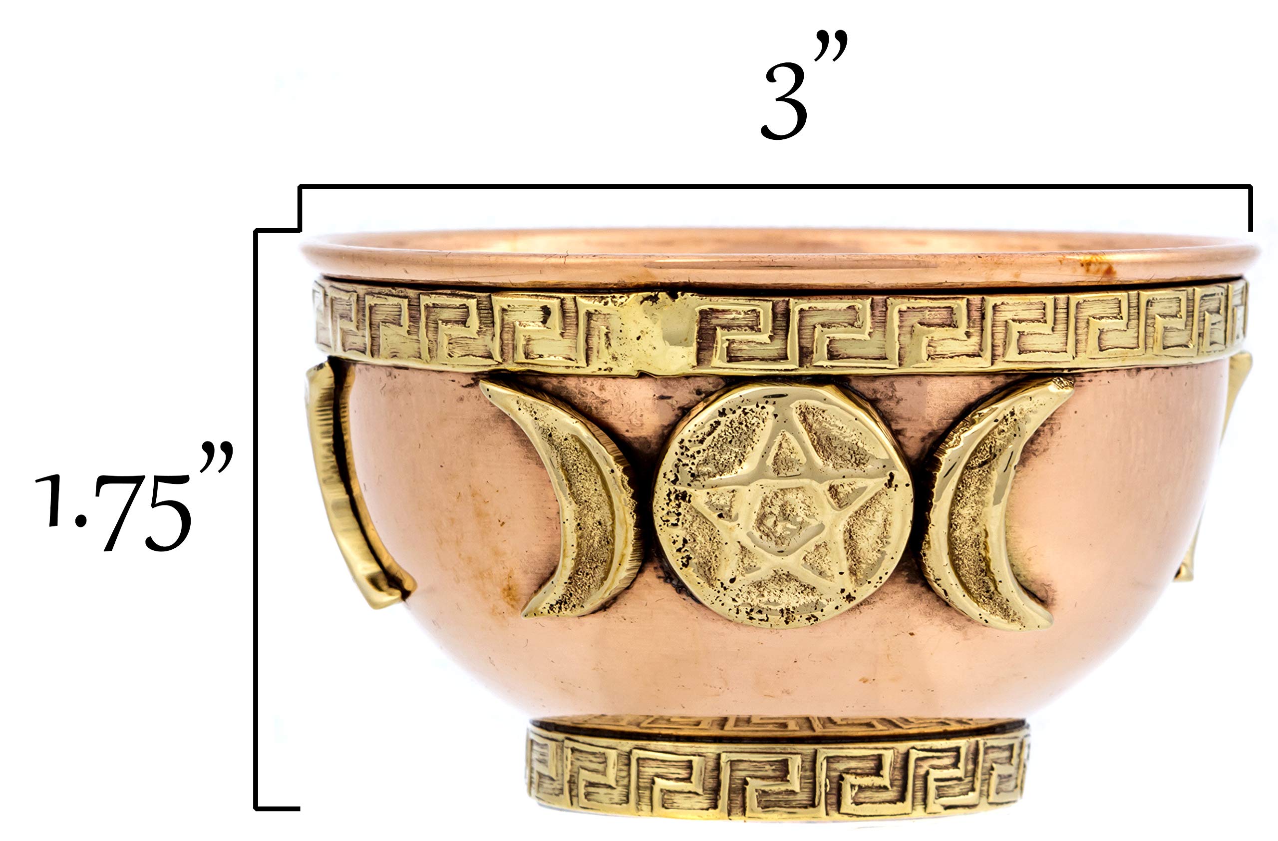 COPPER BOWL - Place offerings to your ancestors, deities, Mother Earth, and more in this copper decorative bowl. Featuring the Triple Moon, or Triple Moon Goddess, a Pentagram set in the full Moon, and the Greek Key trim, let it help enhance your spiritual connection.