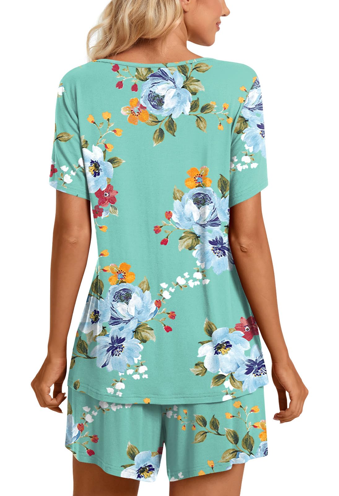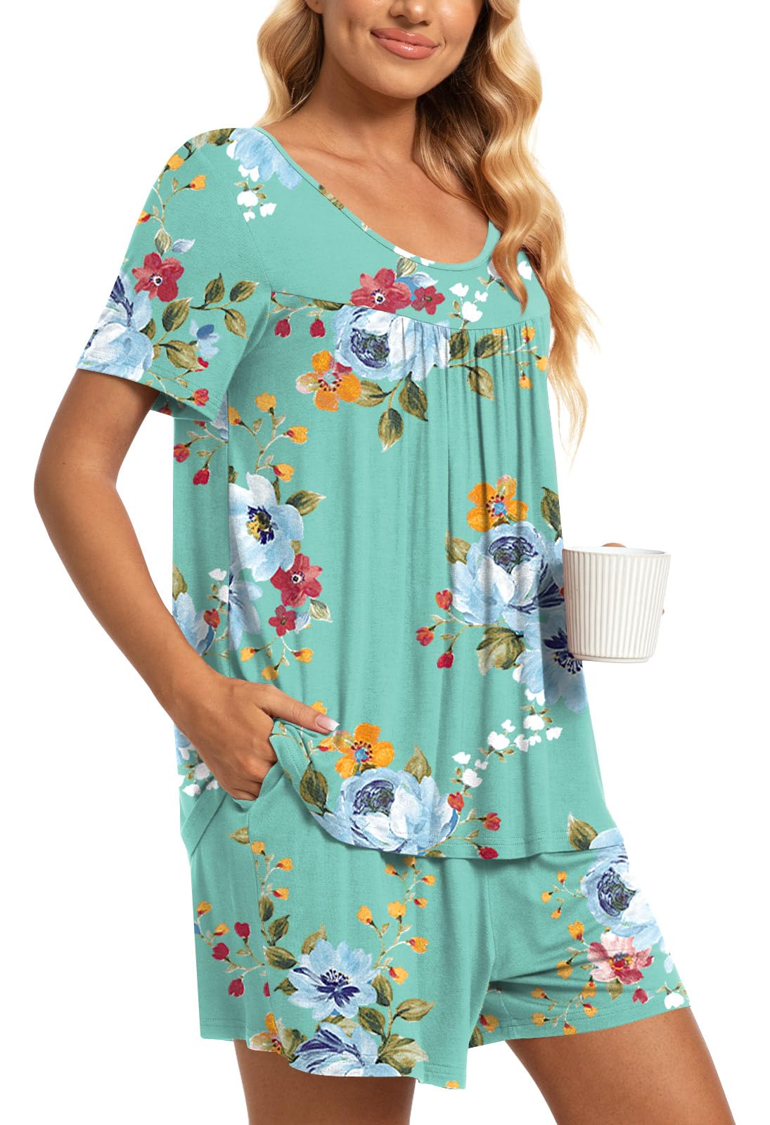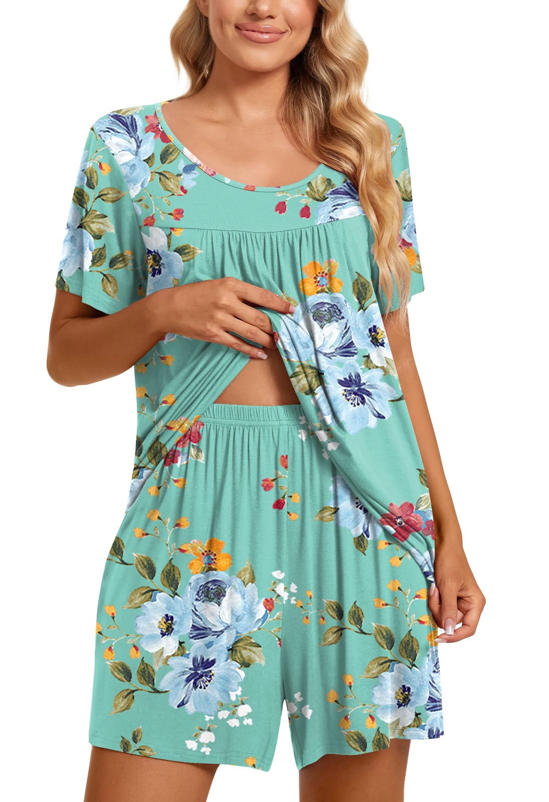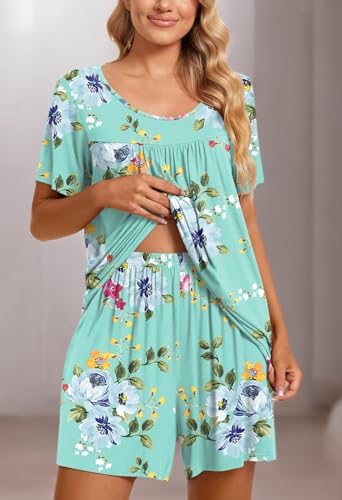 Fashion-Simple Design: Cute two piece outfits, short sleeve tops, soft nightwear, scoop neck and front pleated detailed design. Elastic waistband shorts, casual loose comfy, graceful and easeful