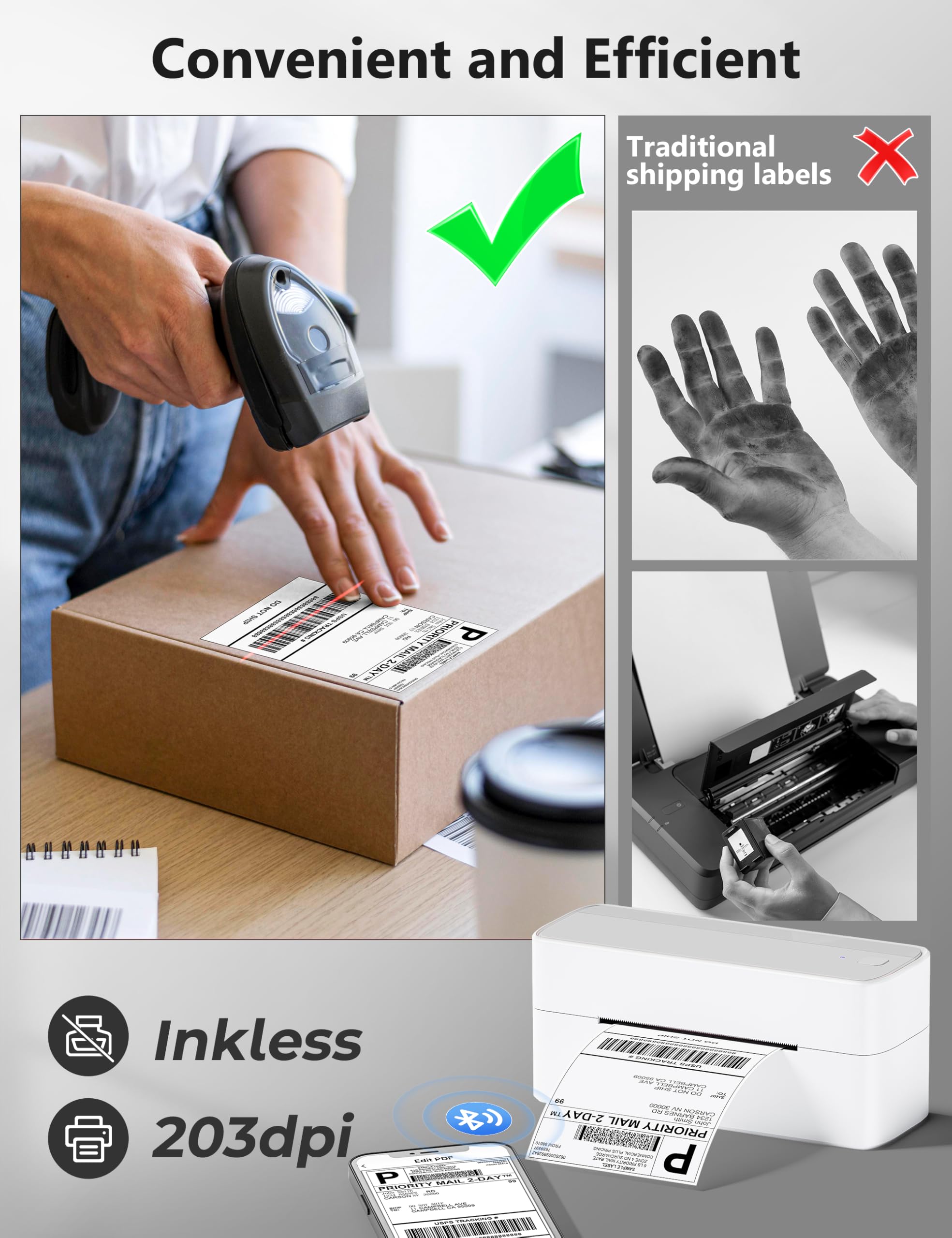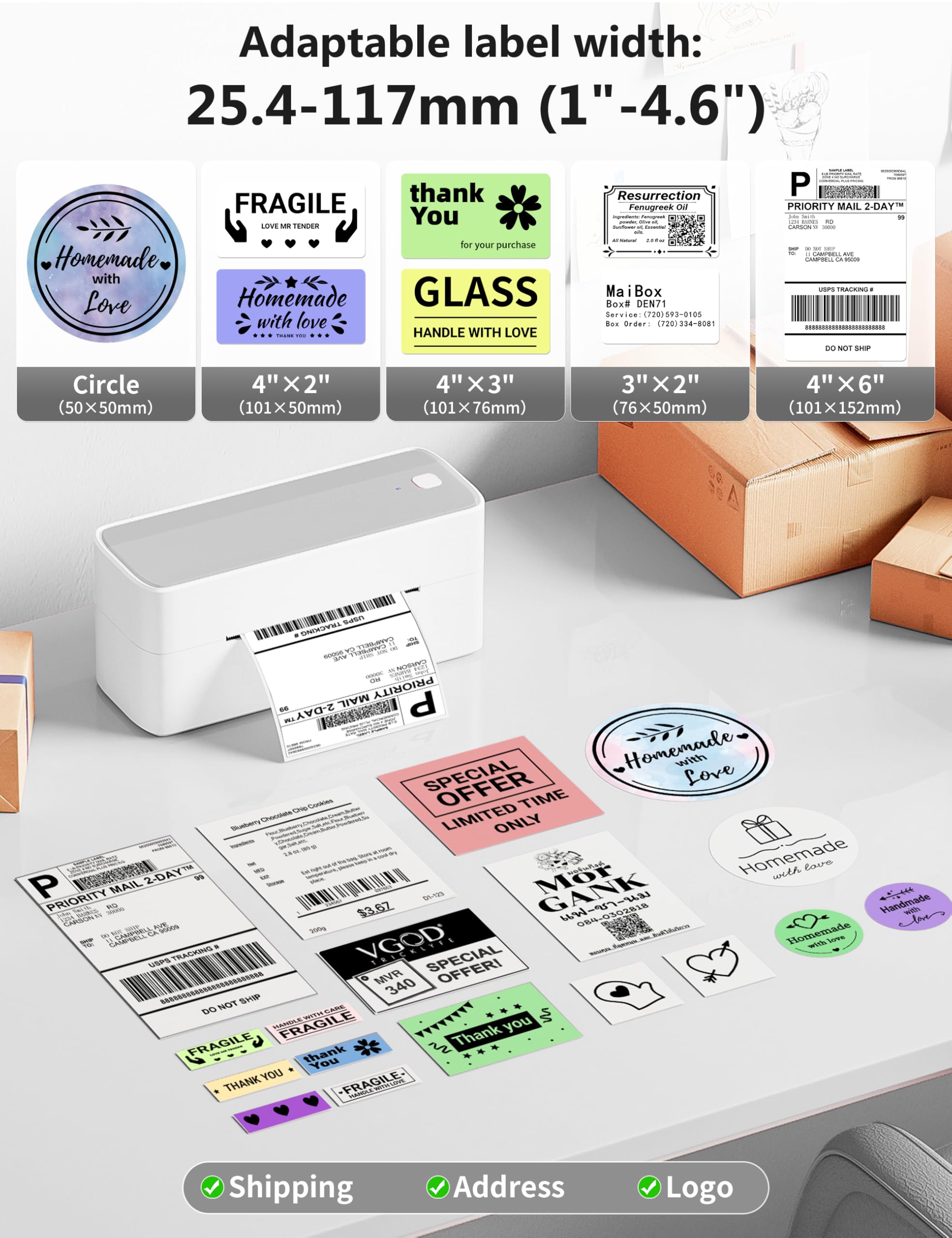 [Various Platforms Compatibility] - This shipping label printer can support the width of 1 - 4.6 inches labels, which is widely used to print labels are compatible with eBay, Shopify, Amazon, Etsy, Poshmark, UPS, USPS, FedEx, ShipStation, DHL, Shippo. One-click use: text, pictures, barcodes, QR codes, Form, Thanks cards, hundreds of icons, and many pre-made templates for commercial and home use. Improve your efficiency. Also a gift for your friends and family