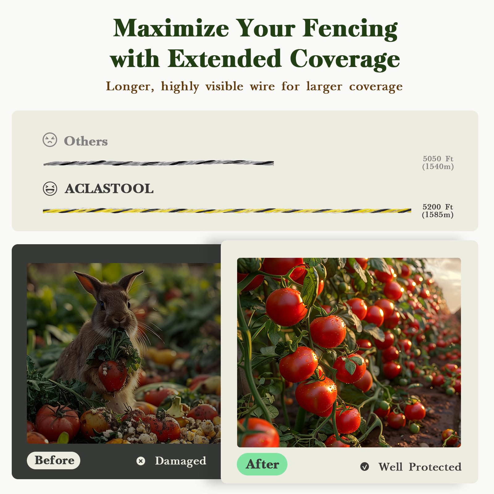 【Strength You Can Count On】ACLASTOOL electric fence polywire is upgraded to a 1/8" diameter, woven with high-quality stainless steel and 15 thicker polymer strands, providing a 140-pound breaking strength. It is tough for animals to crash through, saving farmers and ranchers from the hassle of frequent fence replacements or repairs.