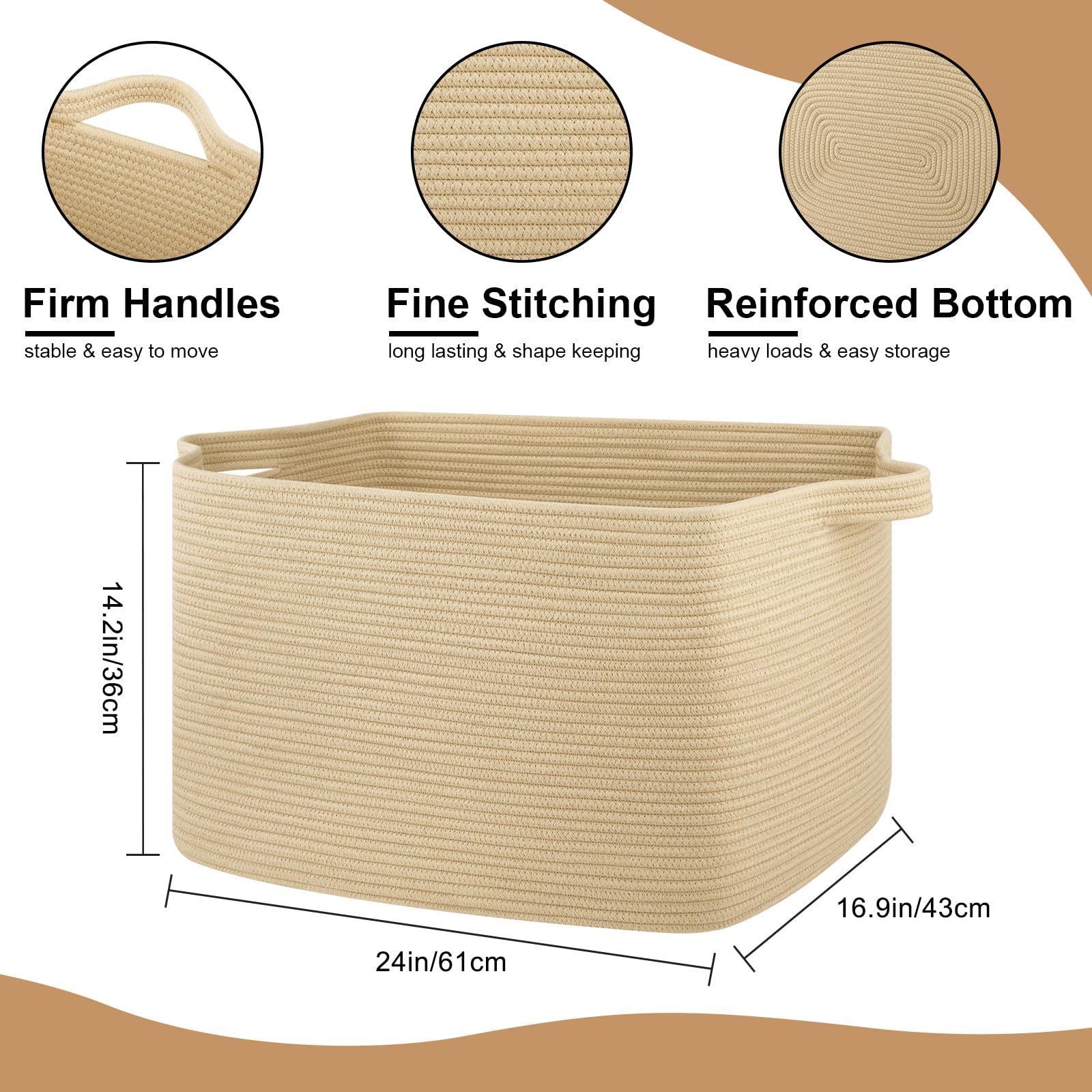 Extra Large Basket for Blankets: 24"L x 16.9"W x 14.2"H, this storage basket with 95L large capacity is perfect for storing blankets, pillows, toys, clothes and stuffed animals. Making your blanket storage for living room becomes easy and convenient