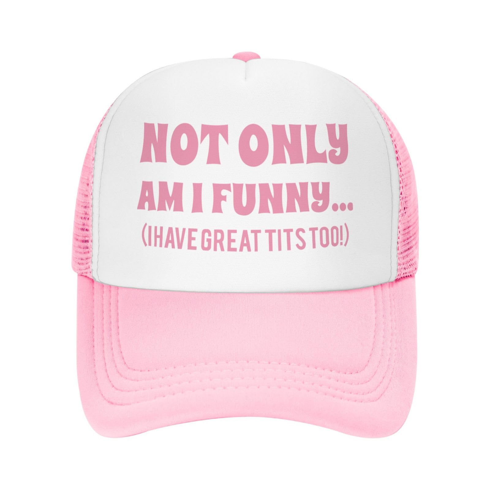 Description Make A Bold Statement With Our Hilarious Funny Trucker Hats For Women! This Womens Trucker Hat Features A Not Only Am I Funny Only Am I Funny I Have Nice Titties Too Print That Blends Edgy Humor With The Timeless Vibe Of Trucker Hat Women. The Vibrant Pink And White Combo Makes These Baseball Hats For Women The Ultimate Accessory For Bachelorette Parties Or Girls' Trips. Designed For All-Day Wear, The Breathable Mesh Back Keeps You Cool While The Curved Brim Provides Uv Protection - Perfect For Summer Festivals. With An Adjustable Snapback, These Funny Hats For Women Fit Most Head Sizes Comfortably. Whether You Need A Cheeky Womens Baseball Hat Or A Laid-Back Trucker Hats Women Style, This Cap Delivers Unbeatable Comfort And Attitude.