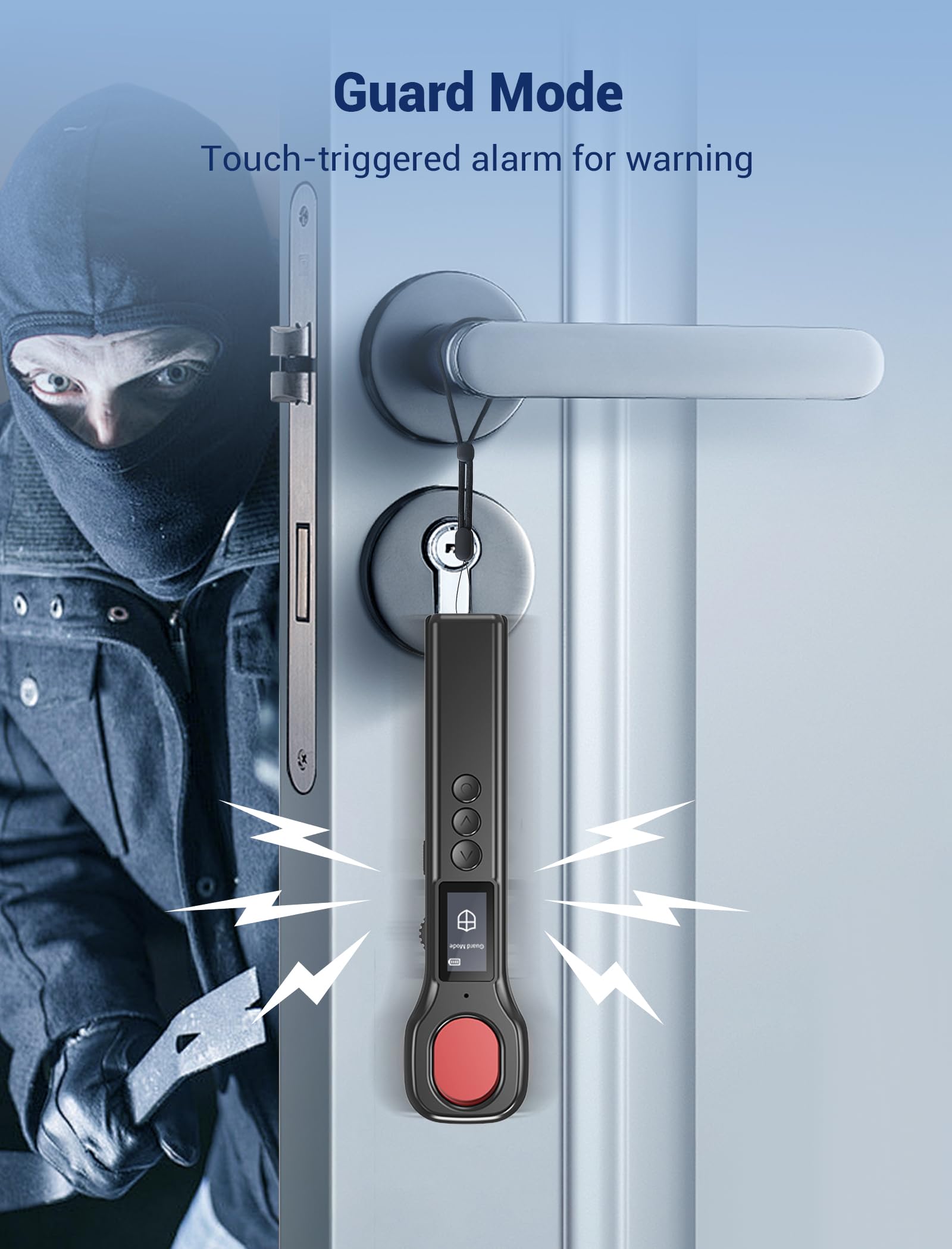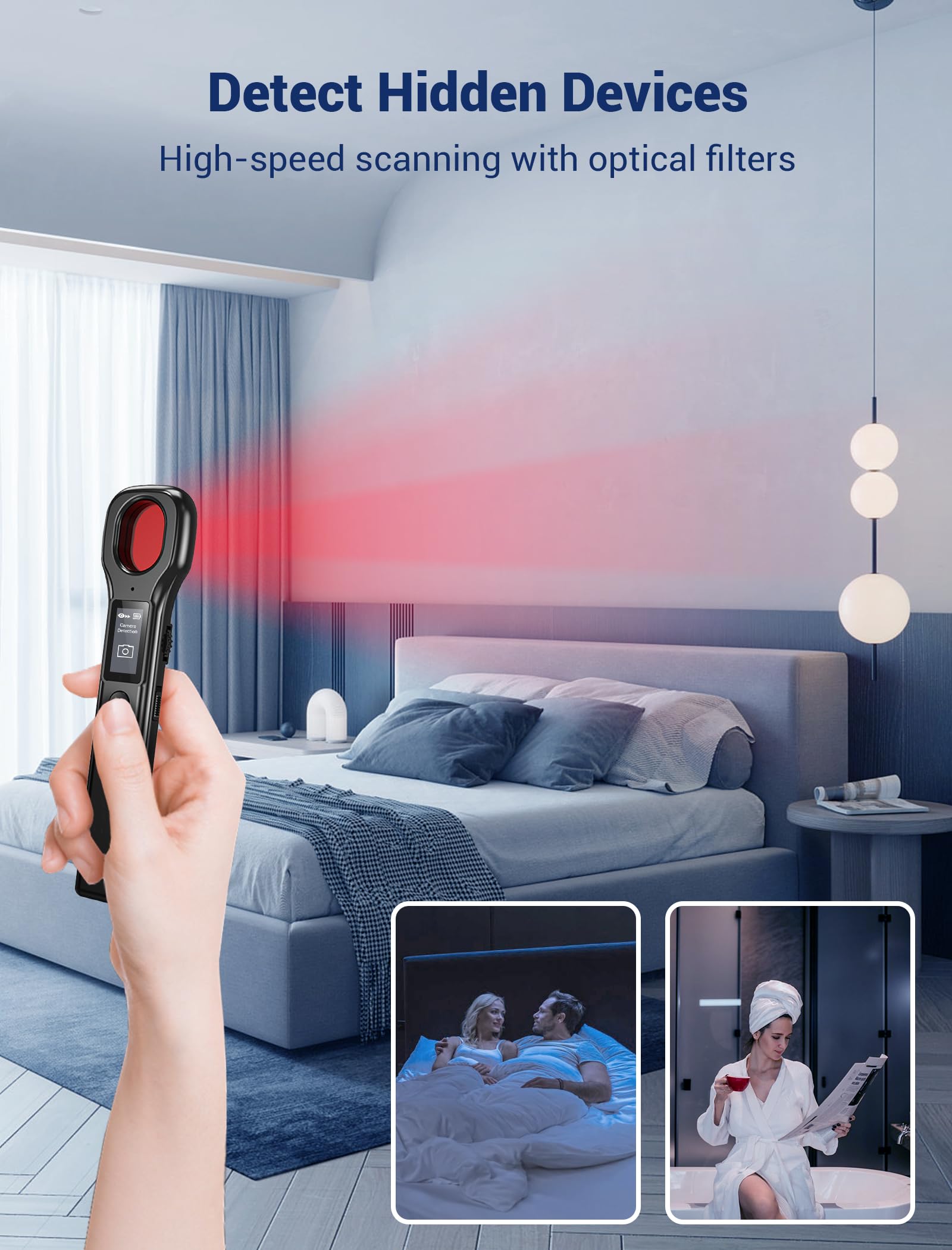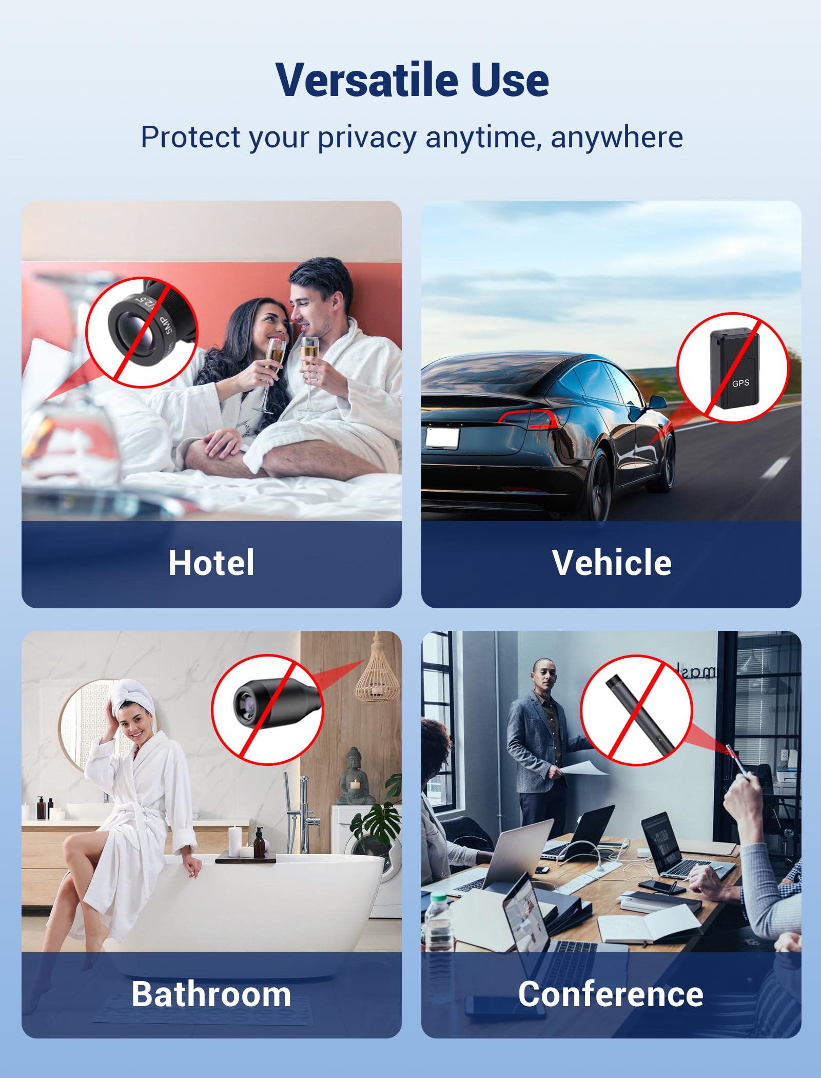 4-in-1 Professional:This detector is passively identifies hidden cameras, listening devices, magnetic attachments, and infrared-enabled equipment using enhanced AI-powered signal detection and physical inspection. Perfect for use in hotels, offices, private residences, and other personal spaces. The device features a physical alarm mode that emits an audible alert when the product itself is triggered with.(Black)