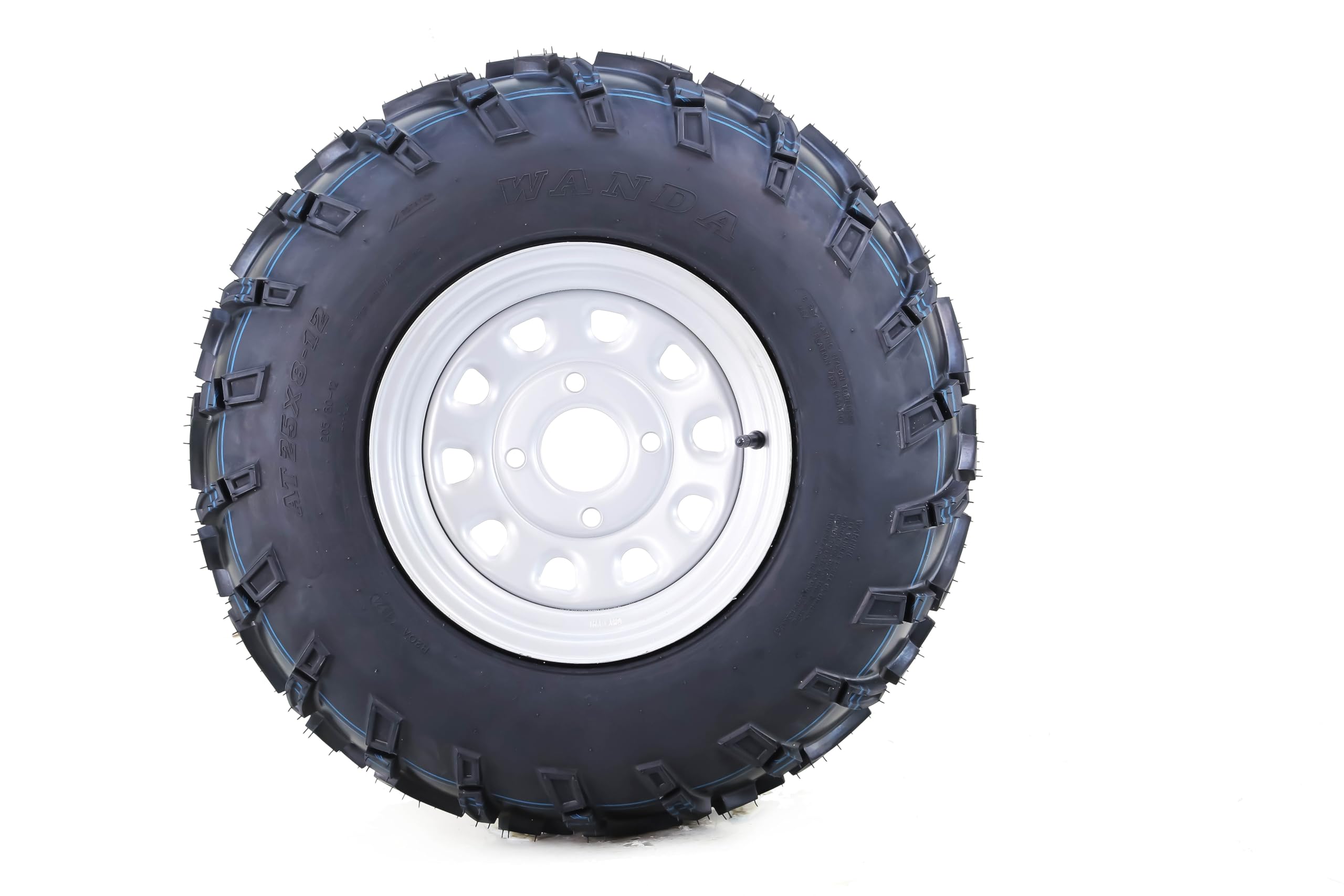 Durable, light weight, smooth rolling design provides quicker acceleration and braking. Deep, widely spaced tread bras shed mud, Excel in a wide variety of terrains. Heavy 6 ply rated nylon construction resists punctures and abrasions. Wheel detail: 4-110mm bolt pattern, center hole: 67.9mm, bolt hole dia: 14.5mm, offset: 5+2, style: Silver mod Tire Specifications Tire Size: 24x8-12 Brand: WANDA Tread Pattern: P373 Ply Rated: 6 Tread Depth: 0.6 Rim Width: 7 Max Load: 252lbs@7psi Load Index: 32 Speed Rating: K Please note: fitment guide is for reference only and does not guarantee the tire will fit your specific model. Please check your owner's manual to ensure proper fitment.