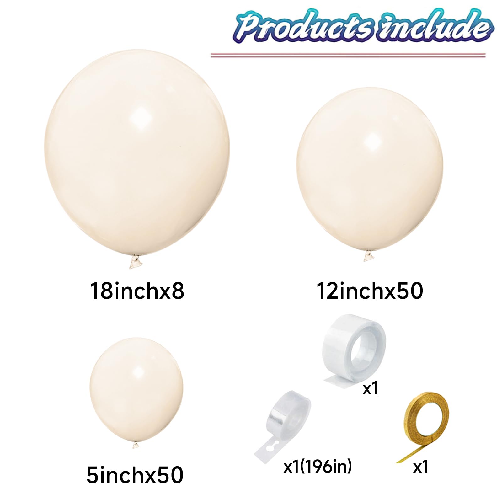 Sand White balloon garland kit: 111Pcs Sand White balloons pack, including 8 pcs 18 inch balloons, 50 pcs 12 inch balloons, 50 pcs 5 inch balloons, a 5 meter balloon chain, 100 dots of glue dots, a roll of ribbon.