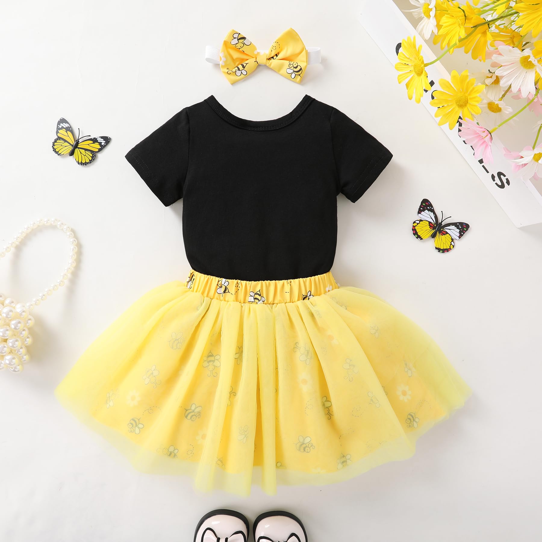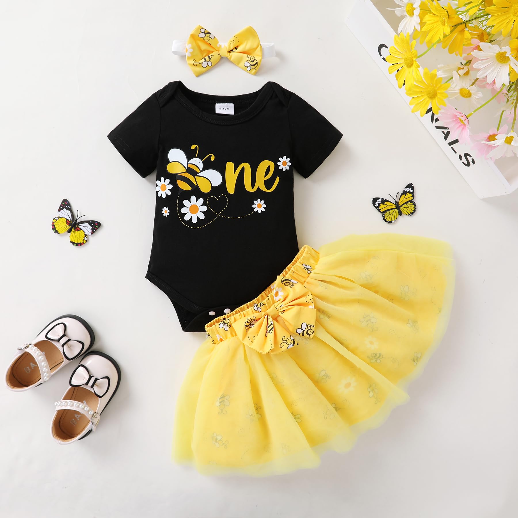 🐝Adorable Design: "ONE"bee/sunflower/cow letters printed in organic cotton romper with yellow tutu skirt, so adorable for your little one.