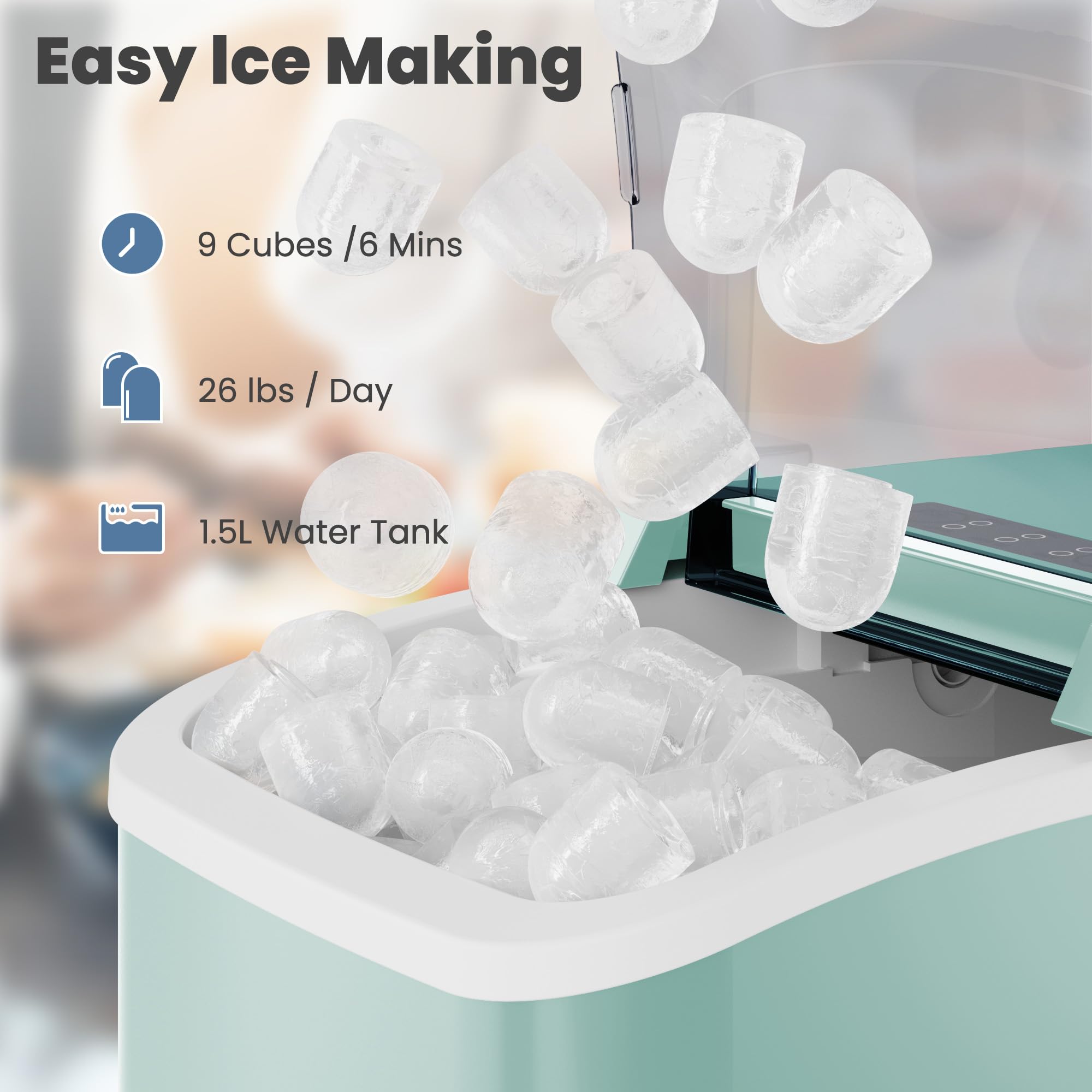 FAST ICE MAKING: The ice maker can make 9 bullet-shaped ice cubes in just 6 minutes. Fill 1.5L of water into the water tank, maximum ice capacity can reach 26.5 pounds in 24 hours. Say goodbye to long waiting times and enjoy a constant supply of ice whenever you need it. It has a transparent window, so you can watch the ice being made.