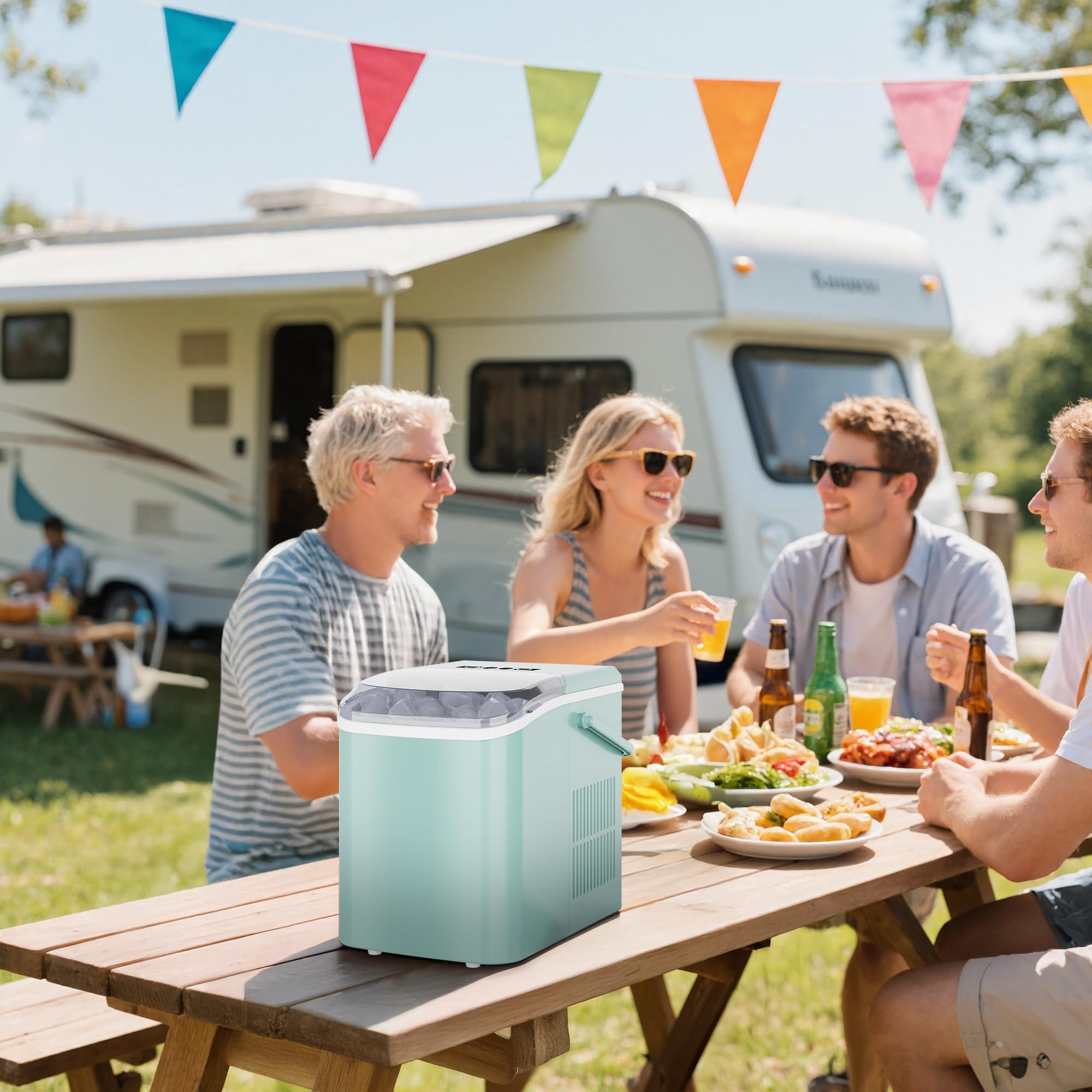 PORTABLE ICE MAKER: This counter top ice machine maker weighs 15.4 pounds and is designed with a convenient carry handle. The small ice maker measures 8.8*11.6*12.5 inches. You can place the mini portable ice maker countertop anywhere, perfect for the kitchen, office, bar, camping, RV, or parties.