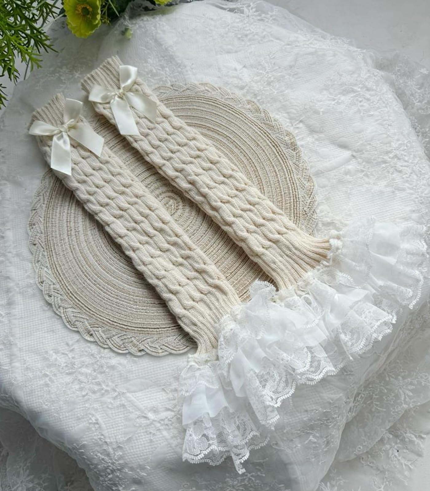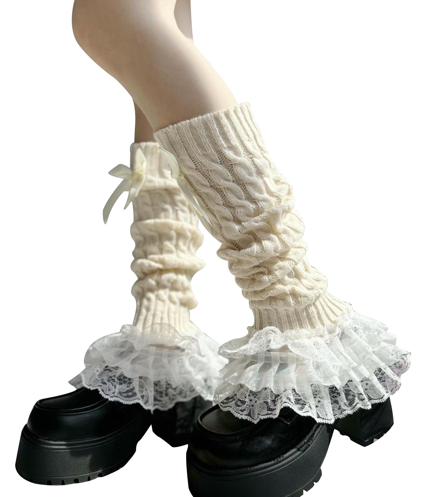 Charming Design: These knitted leg warmers feature an elegant decorative bow at the cuffs and flared layers of lace at the bottom, creating a visually stylish and eye-catching look