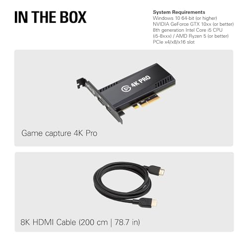 "8K60 passthrough, 4K60 capture! VRR and true 10-bit HDR. 4K Pro turns your high-end PC or dual PC setup into the ultimate streaming machine, and leaves your gameplay alone. Equipped with HDMI 2.1, you can even play in high resolutions at high frame rates, like 4K240, and capture ultra-smooth 1080p240 footage of your performance – all while ultra-low latency circuitry keeps your gameplay and capture feed perfectly synced. From PC, PS5, and Xbox Series X to Nintendo Switch, Steam Deck, ROG Ally, even iPhone 15 – we’ve made sure 4K Pro plays beautifully with your beloved machine. Because you've invested in high-end gear for the best gaming experience possible, and you shouldn’t have to compromise that. System Requirements Windows 10 64-bit (or higher) 8th generation Intel Core i5 CPU (i5-6xxx) / AMD Ryzen 5 (or better) NVIDIA GeForce GTX 10xx (or better) PCIe x4/x8/x16 slot Technical Specifications Input: HDMI (unencrypted) Output: HDMI (lag-free passthrough) Recording resolution: up to 4K60 Passthrough resolution: up to 8K60 HDR10: passthrough & recording"