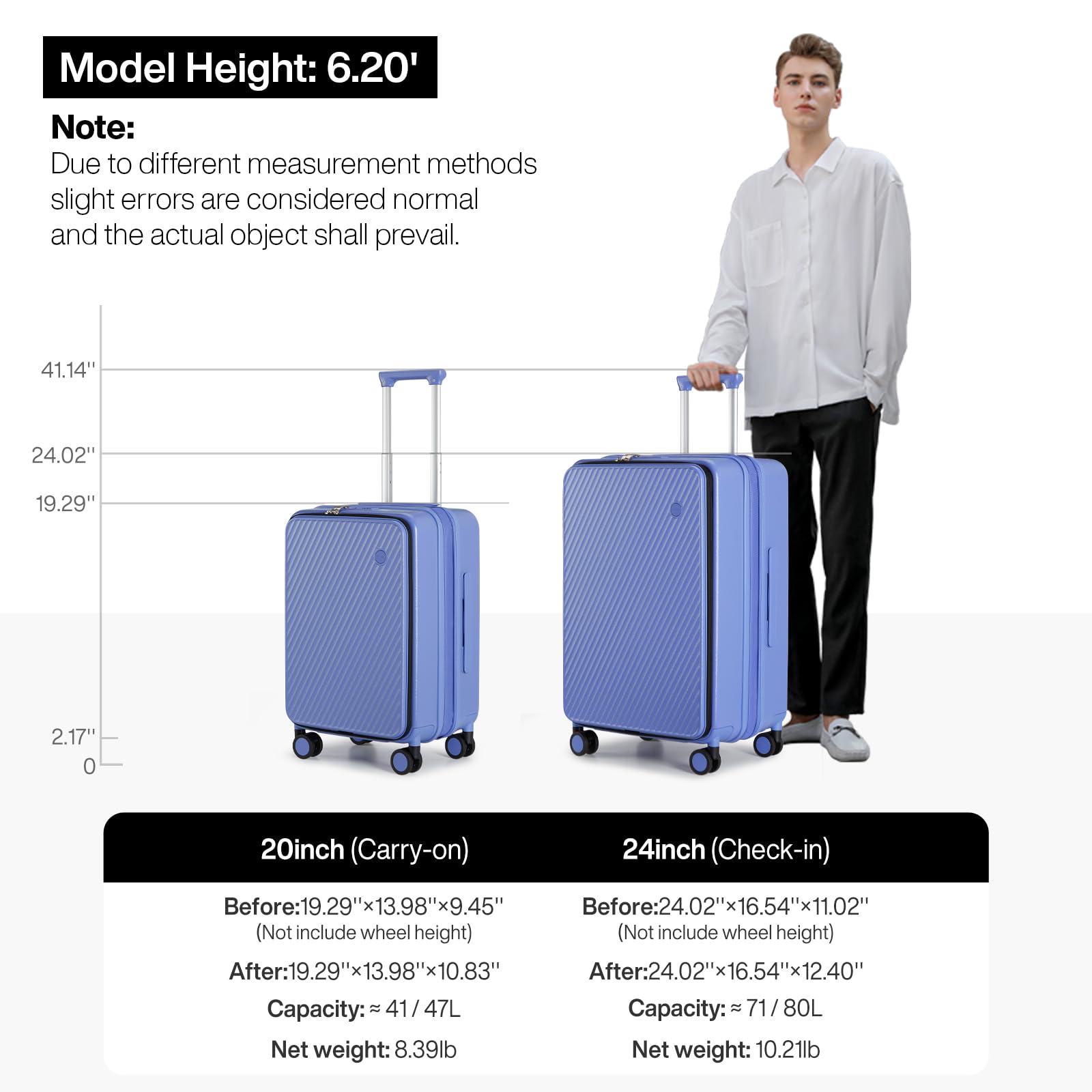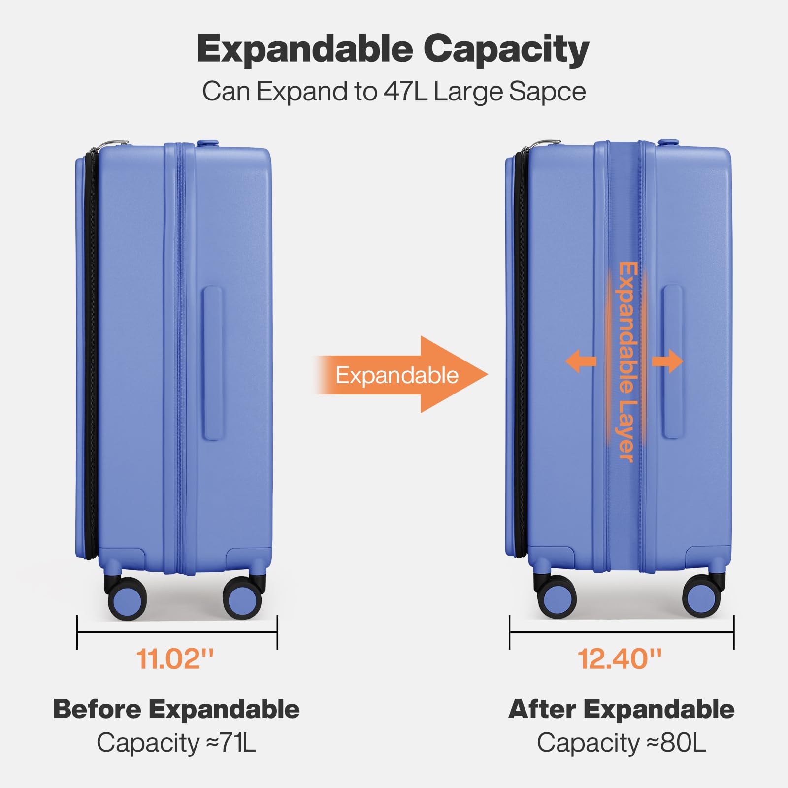 【Expandable Checked Luggage】 Dimensions: 16.53x11.02x25.98 IN (Including wheels), Weight: 10.21 LB. This luggage features an expandable zipper, increasing capacity from 71L to 80L. The spacious main compartment enables convenient and organized packing during your journey