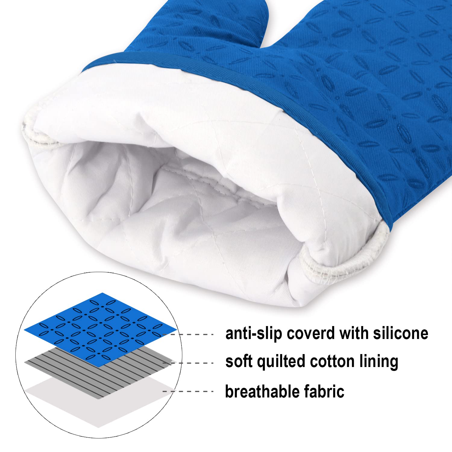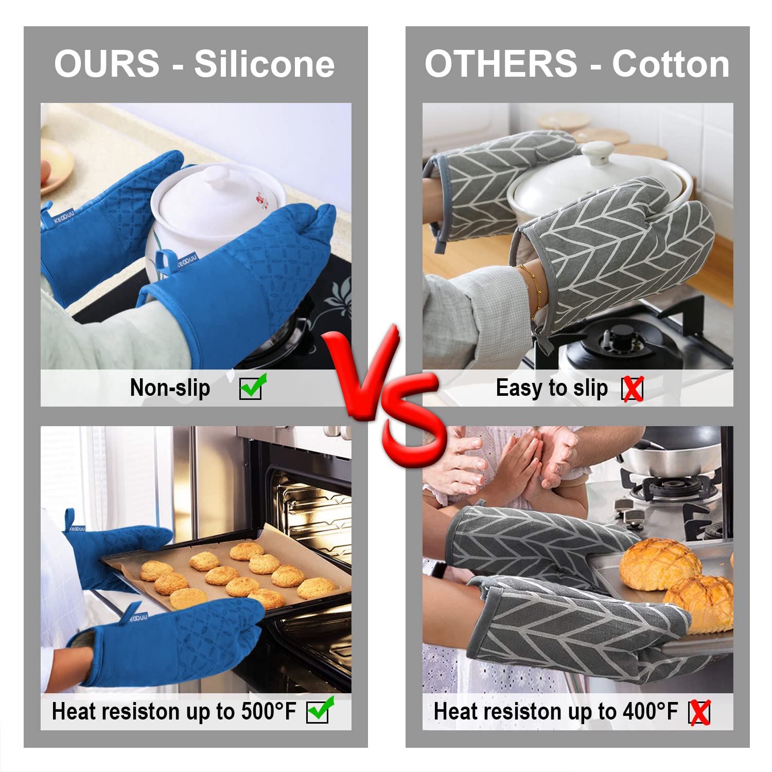 500°F HEAT RESISTANT &NON-SLIP - This oven mitts heat resistant 500 degrees because of the durable construction so it can effectively keep you protected from burning while you enjoy cooking and grilling. Enhanced with anti-slip silicone design to provide a more robust, non-slip grip that can be held securely when handling the kitchen utensils