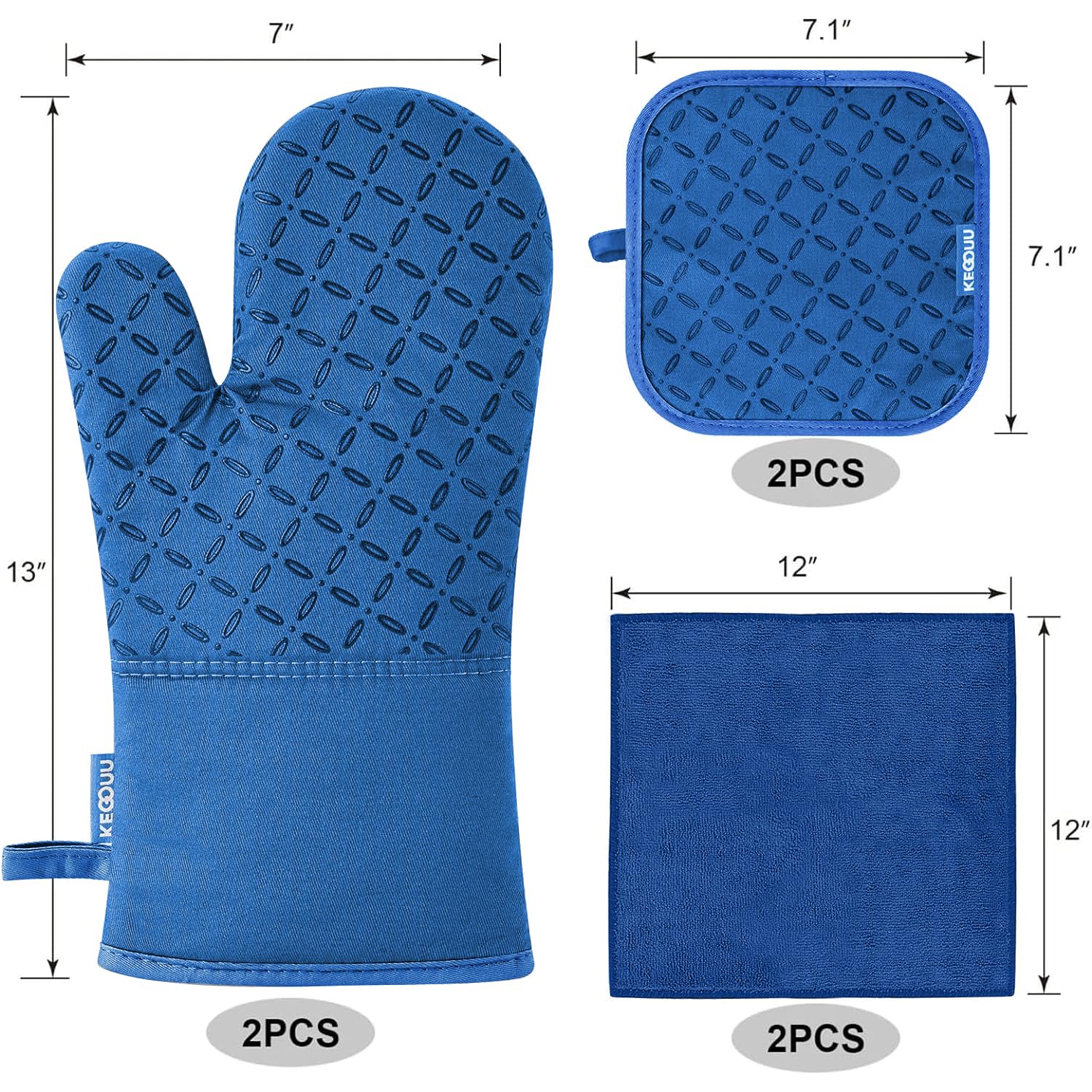 6 PIECE KITCHEN ACCESSORY SETS: -Our oven mitts and pot holders set including 2pcs non-slip surface silicone kitchen oven gloves (7X13in), 2pcs pot holders (7X7in) and 2 kitchen towels (12x12in), fit for indoor cooking, baking,BBQ or outdoor grilling. Also the oven mitt set is a perfect ideal kitchen gift for women, men, baker, cooker