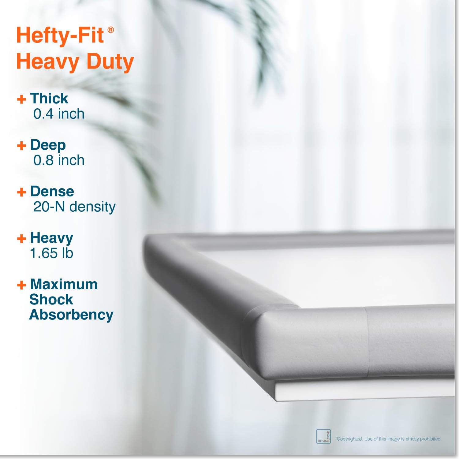Childproofing Products. Corner and Edge Protector for Baby Proofing Furniture and Fireplace. HeftyFit HEAVY-DUTY PREMIUM RUBBER FOAM: Shore A 20-N density / 0.4-inch thick / 0.8-inch deep - maximum impact absorbent.