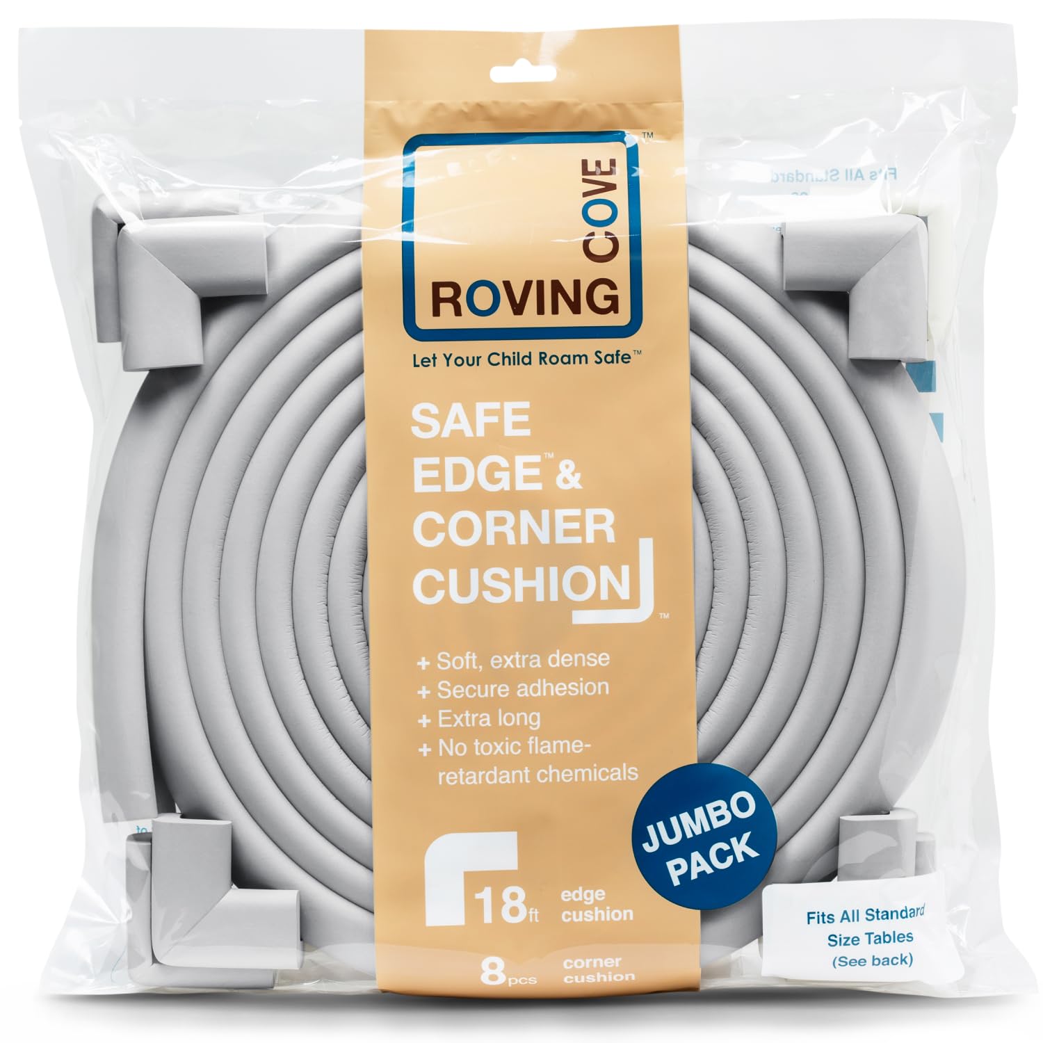 JUMBO PACK: Covers 20.4 feet (245 inches) of surface area: 18 feet (5.5 meters) edge guards + 8 corner guards. Fits all standard size tables (round table up to 69" diameter, square table up to 56" square and rectangle table up to 36" x 78"). L-Shaped safety bumpers. Industrial strength.