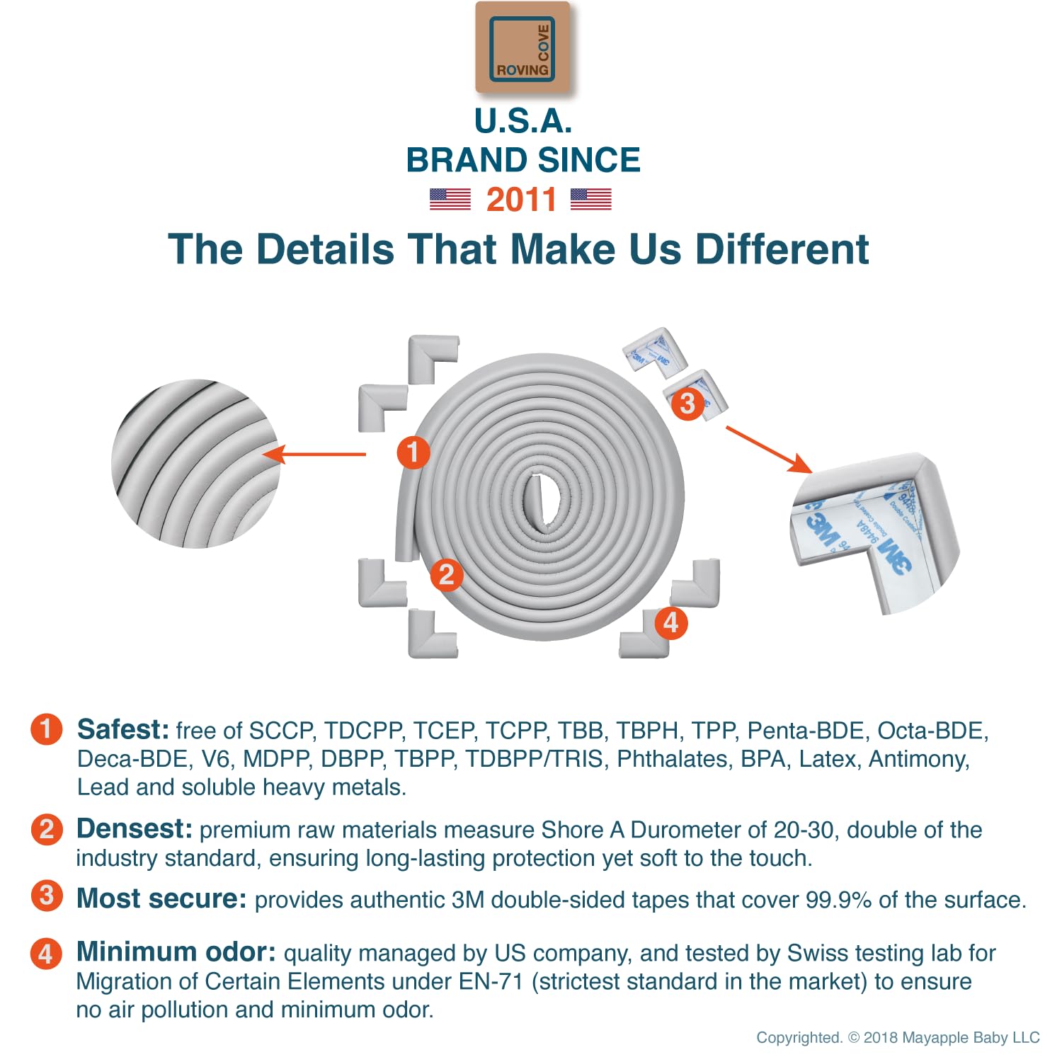 CLEAN SAFETY: Roving Cove uses safe and pure raw material and was the first brand to make foam safety bumpers without the use of toxic flame-retardant chemicals (SCCPs). Our edge corner guards contain no BPA, no phthalates, no heavy metals, no latex, no SCCPs. Inherently flame-resistant; passed flammability tests under US regulations.