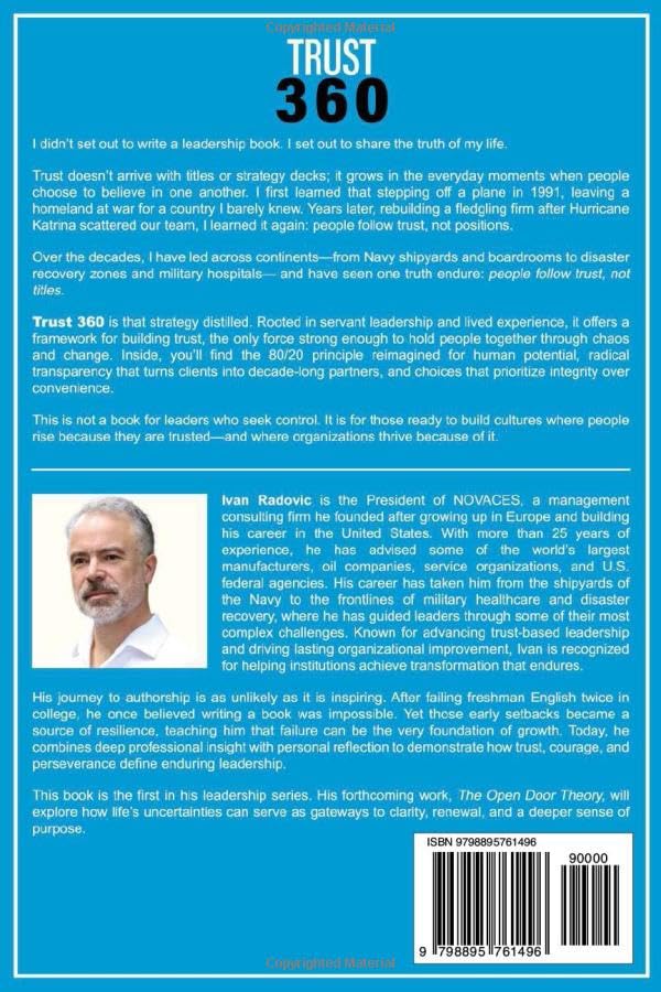 Trust 360: How Authentic Leaders Build Trust, Inspire Teams, and Drive Success in an Ever-Changing World Trust has been my compass through war, migration, and the unpredictable turns of business. I left Yugoslavia in 1991 as my home country descended into conflict, and years later, Hurricane Katrina scattered the consulting firm I had co-founded in New Orleans. In both moments, I witnessed how quickly systems collapse when trust is weak, and how resilient people become when it is strong. Over the past 25 years, my work has taken me across continents and industries: from Navy shipyards to disaster recovery zones, Fortune 500 boardrooms to military hospitals. Across cultures and careers, one truth remains constant: trust is not sentiment—it is strategy. Trust 360 distills that truth into a practical, field-tested framework for modern leadership. Inside, you’ll discover: A 360-degree approach to building trust across teams, clients, suppliers, and communities. Servant-leadership practices that flatten hierarchy and unlock innovation. The 80/20 principle applied to people: helping leaders amplify strengths instead of policing weaknesses. Tools for embracing generational change and emerging technologies, such as AI, without compromising authenticity or credibility. Throughout the book, I share stories from real-world leadership dilemmas, from standing by a teammate when a client demanded their removal to earning long-term loyalty through radical transparency. This is not a theory. It is leadership lived in complexity. I hope that Trust 360 helps you create a culture where people rise because they know they are trusted—and where organizations thrive because trust is their quiet foundation.
