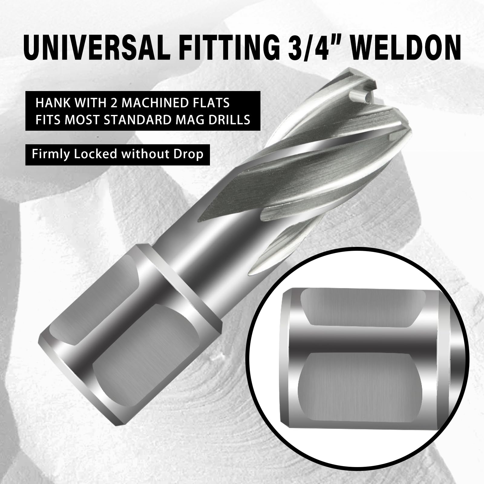 Cnc-machined high precision annular drill bit set with 3/4 inch weldon shank (with 2 flats) for secure clamping and edge finish designed for smooth, reamed, burr-free edges of drilled holes. Use a firm steady pressure throughout the cut for better results