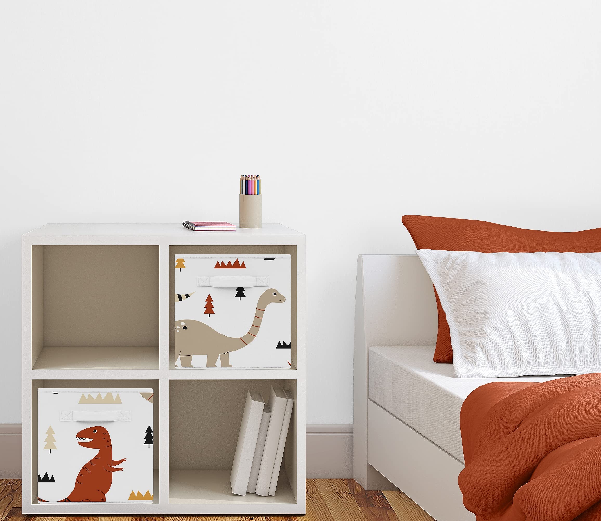 Features a rust orange, taupe, beige and black modern dinosaur print