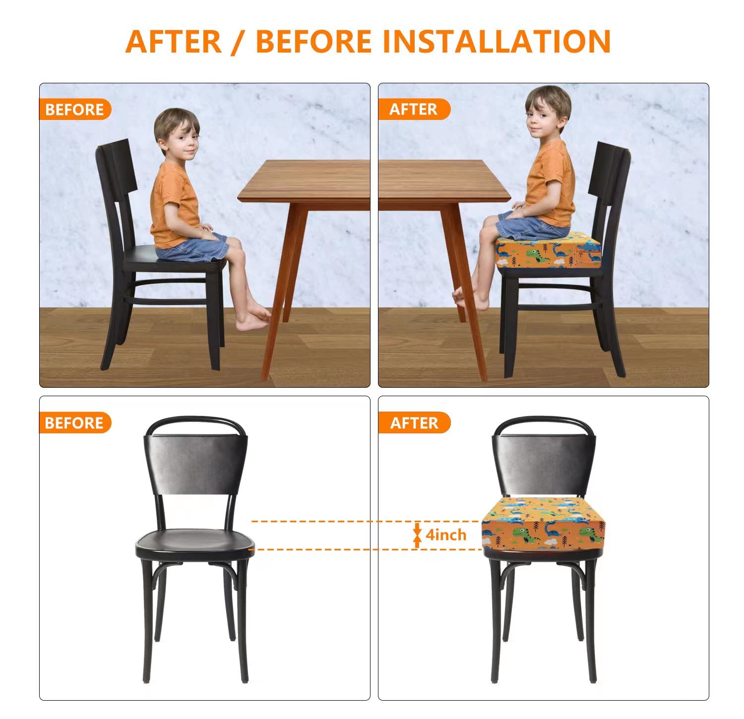 【Safety & Installation】-Two adjustable belts on the cushion suitable Heightening dining table seat of different sizes chair.The bottom of cushion has compact non-slip particles,There is no need to worry about sliding or slipping.