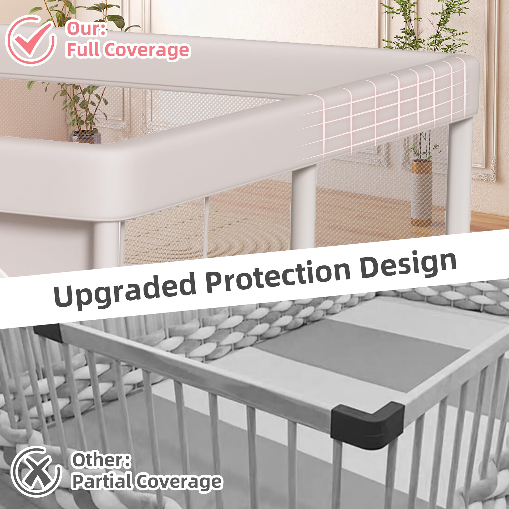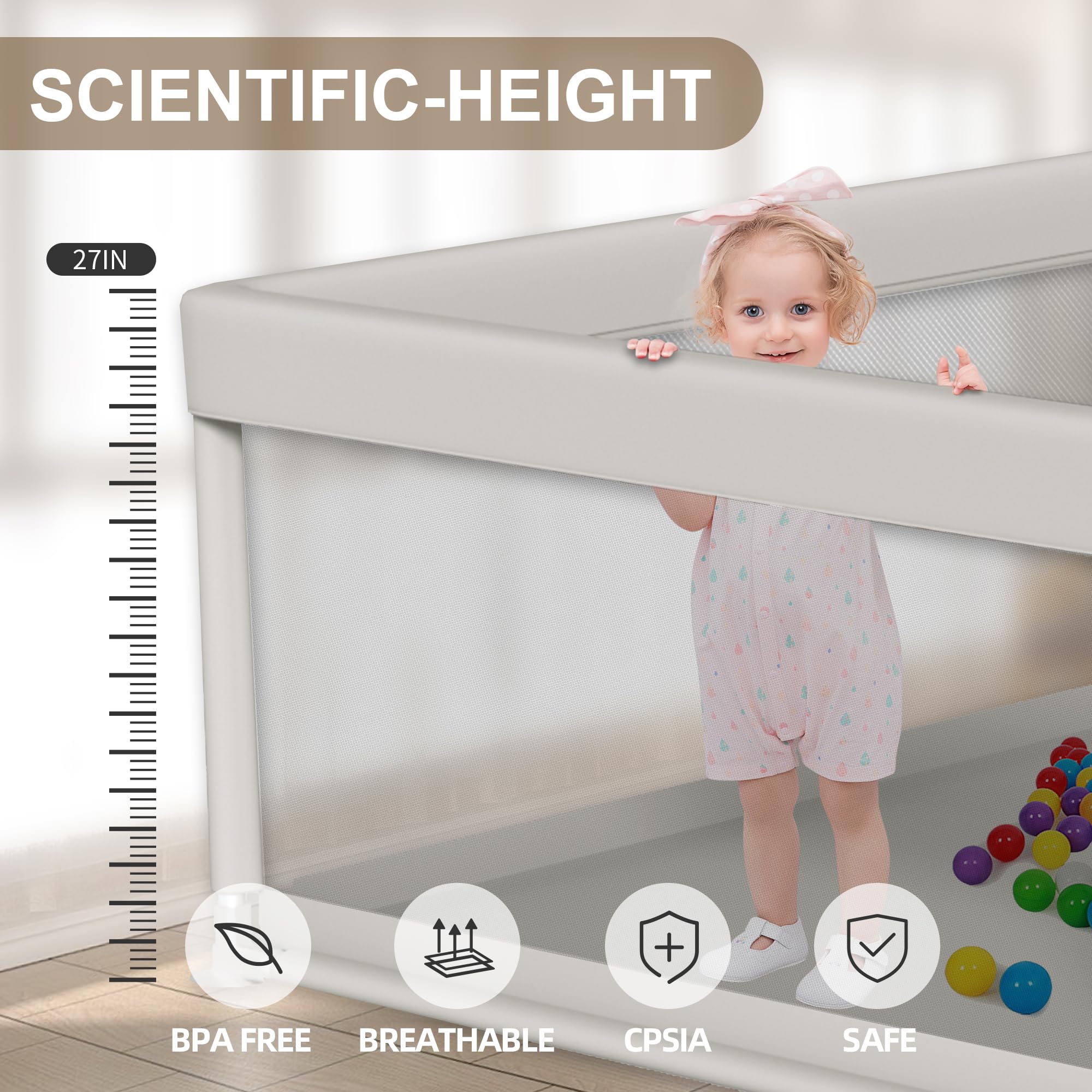 SAFETY PROTECTION: Our baby playpen is made of non-toxic encrypted 320D Oxford cloth, passed the US CPSIA test, and the top is fully covered with a sponge, which increases the cushioning effect and effectively prevents injuries caused by collisions.