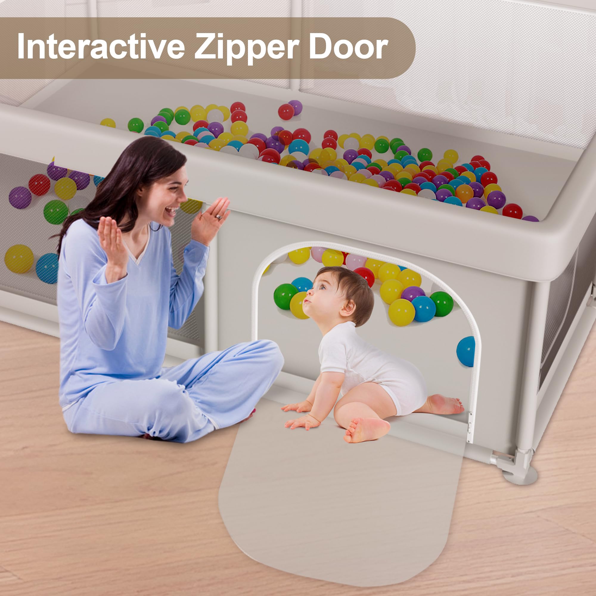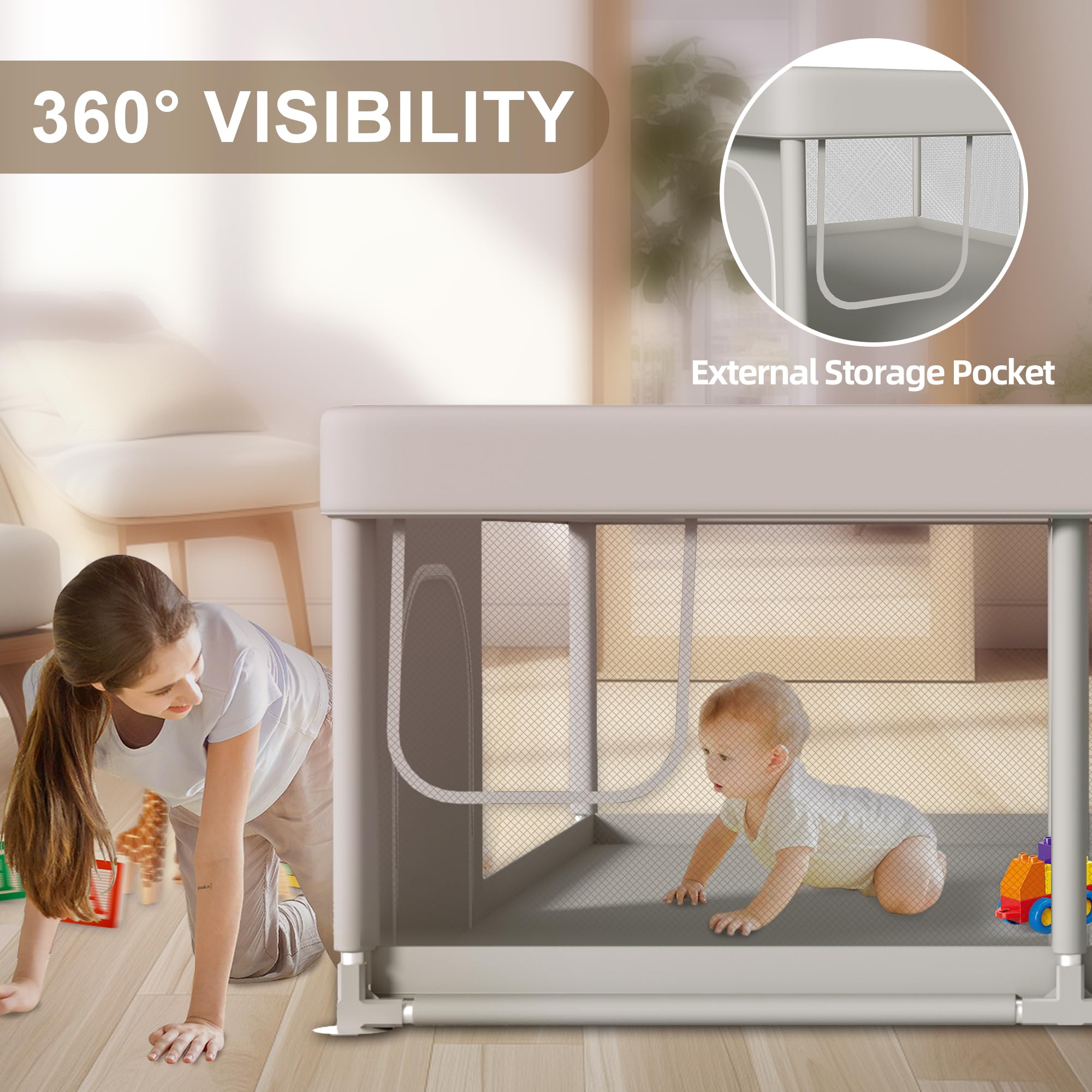 ALL-VISION DESIGN: The breathable mesh design provides a 360Β°viewing angle, freeing the mother's hands at any time, The mom can do her own thing at any time, and the external zipper design prevents the baby from accidentally running out of the baby playpen