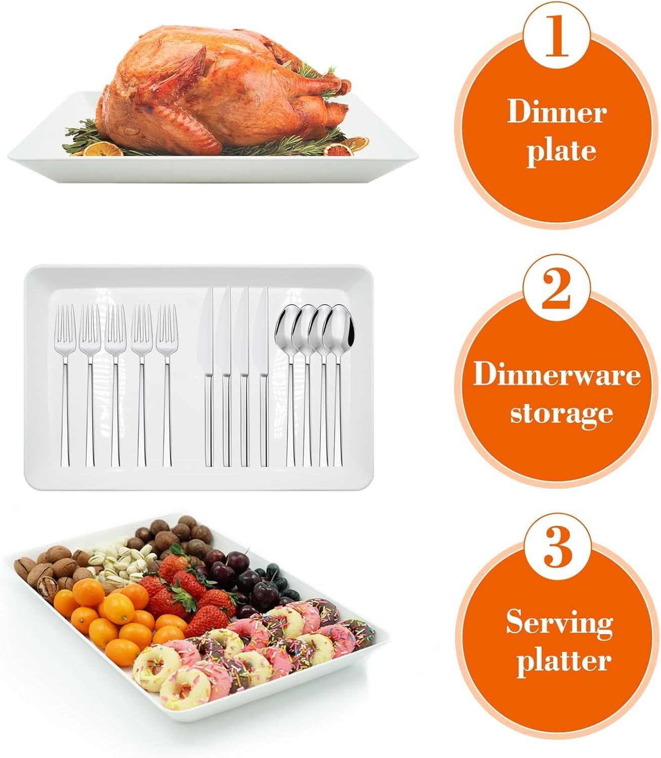 Multi Function: Plastic serving platters and bowls for entertaining. Paired with food display risers at parties, they enhance presentation. Ideal for brunch setups, they also serve as lunch trays, and the charcuterie tray is perfect for elegant spreads
