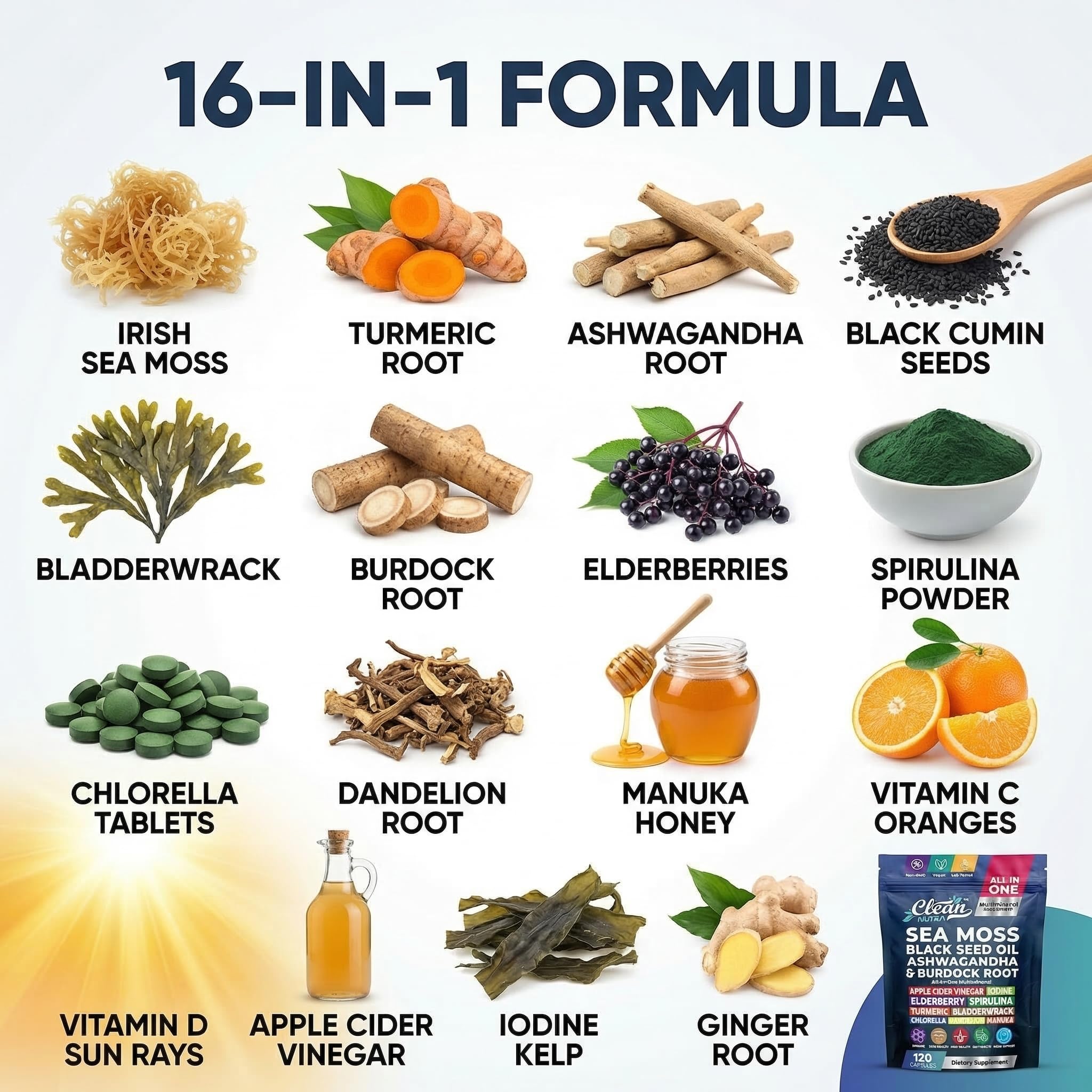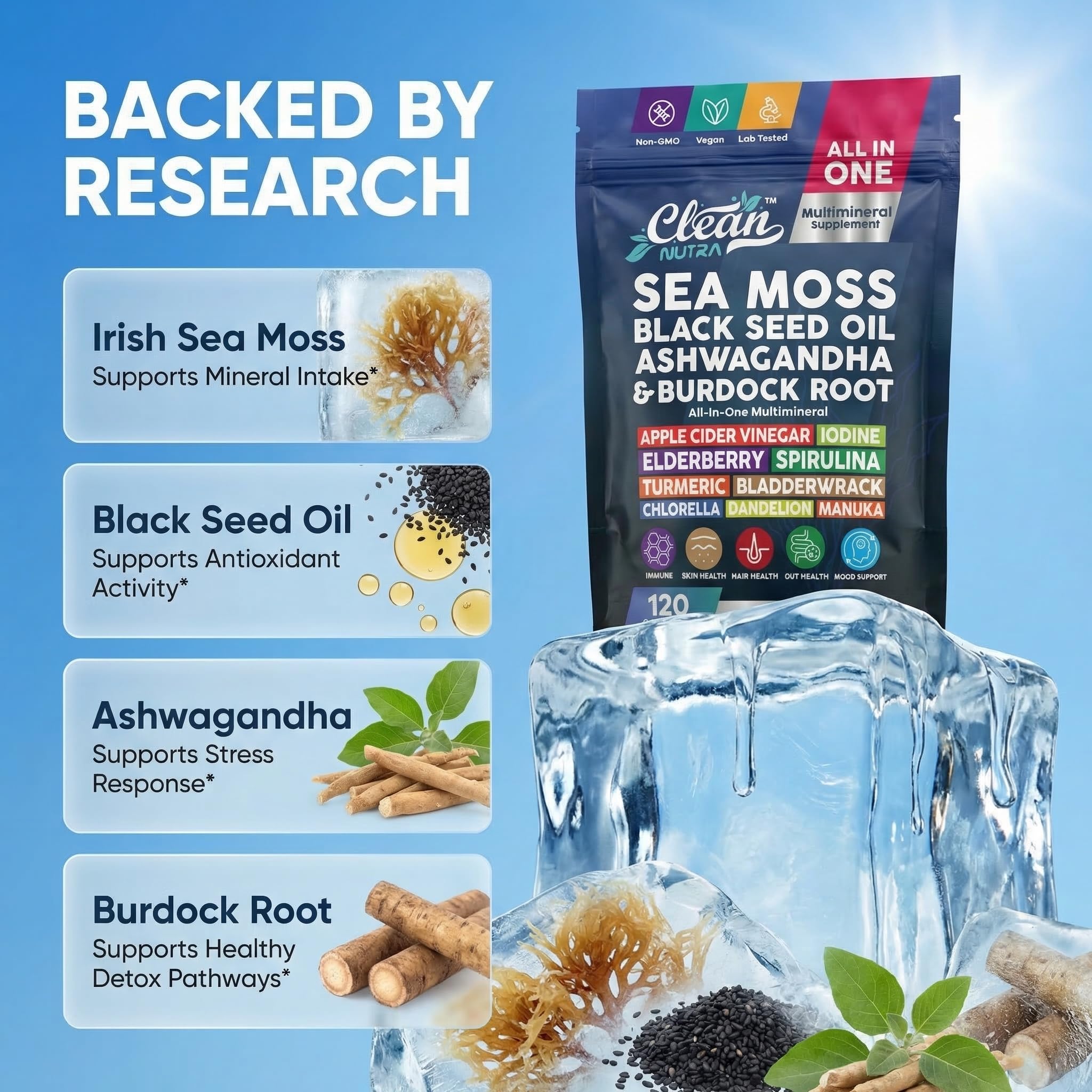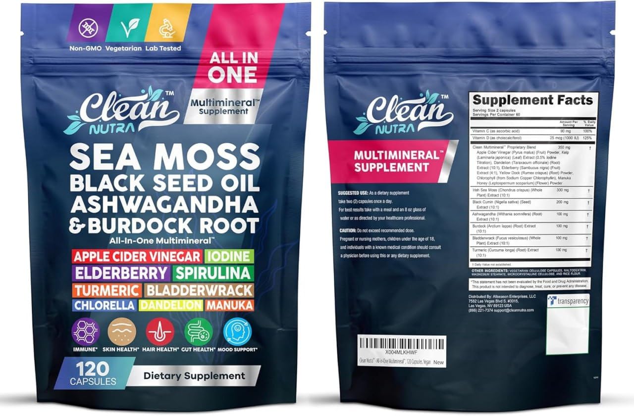 A Powerful All In One Supplement - Clean MultiMineral is overflowing with potent Sea Moss Supplement, Black Seed Oil capsules, Aswagandhada capsules, Burdock Root, Bladderwrack and turmeric powder. Clear out those countless supplements in your supplement cabinet, and replace it with just one seamoss powder, black seeds oil, aswagandhada capsules, and burdock supplement 15-in-1 formula from Clean Nutraceuticals. We made Irish seamoss bladderwrack burdock capsules better by adding black seed.
