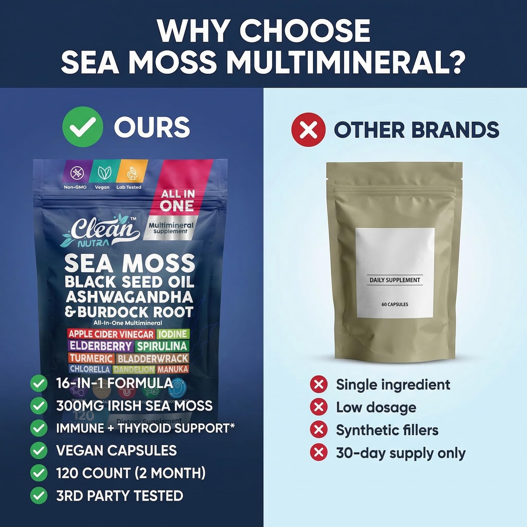 Introducing the MultiMineral Blend - Sea Moss Pills, Black Seed Oil Pills, Ashwagandha Root, Bladderwrack Capsules and Burdock Root Capsules that contain 10+ powerhouse ingredients, turmeric curcumin capsules, Apple Cider Vinegar, Chlorophyll, Manuka Honey, and more! These sea moss bladderwrack burdock root capsules are alternatives to sea moss gummies, black seed oil gummies, and ashwagandha gummies for men. Not usual sea moss raw organic, wildcrafted sea moss gel or ashwagandha supplements.