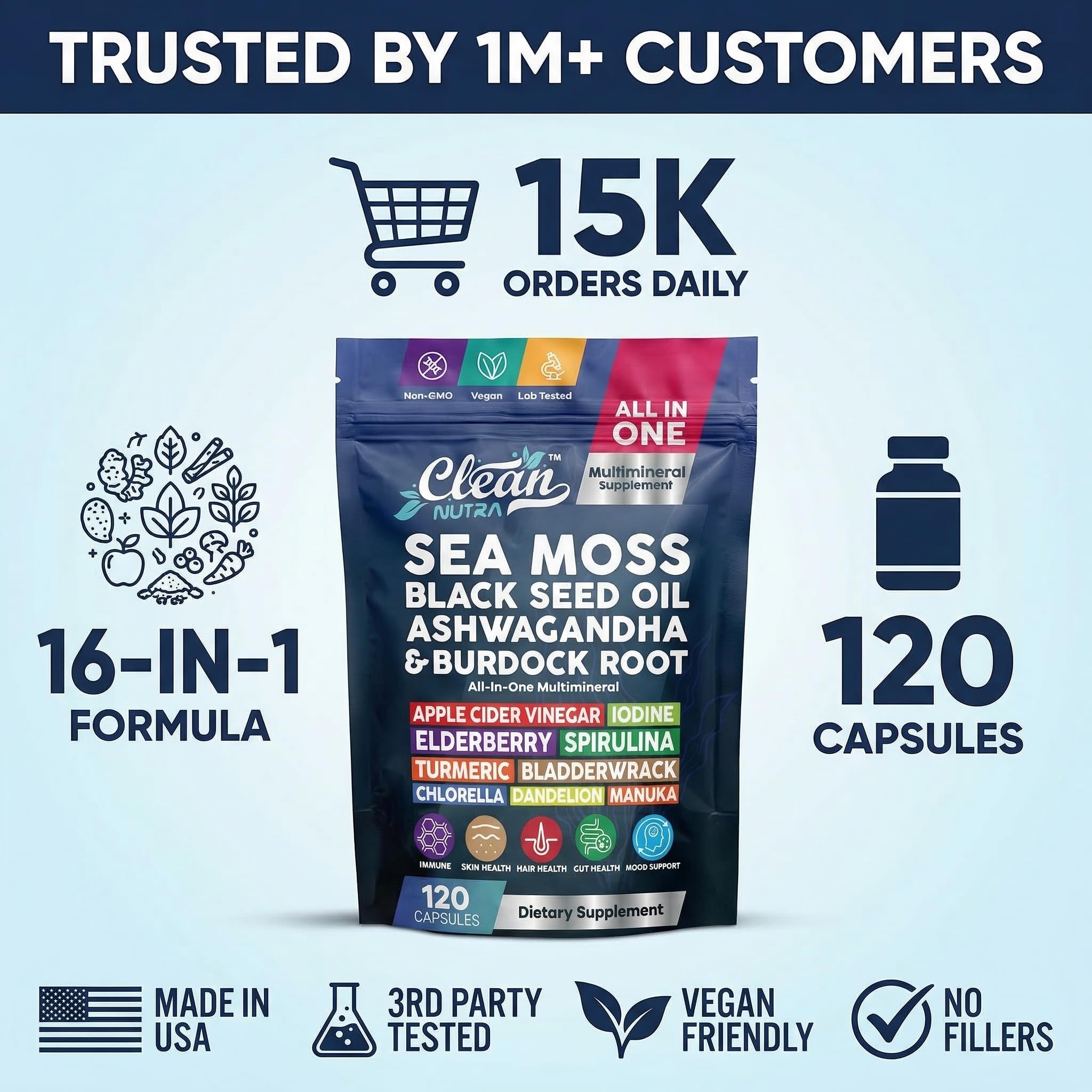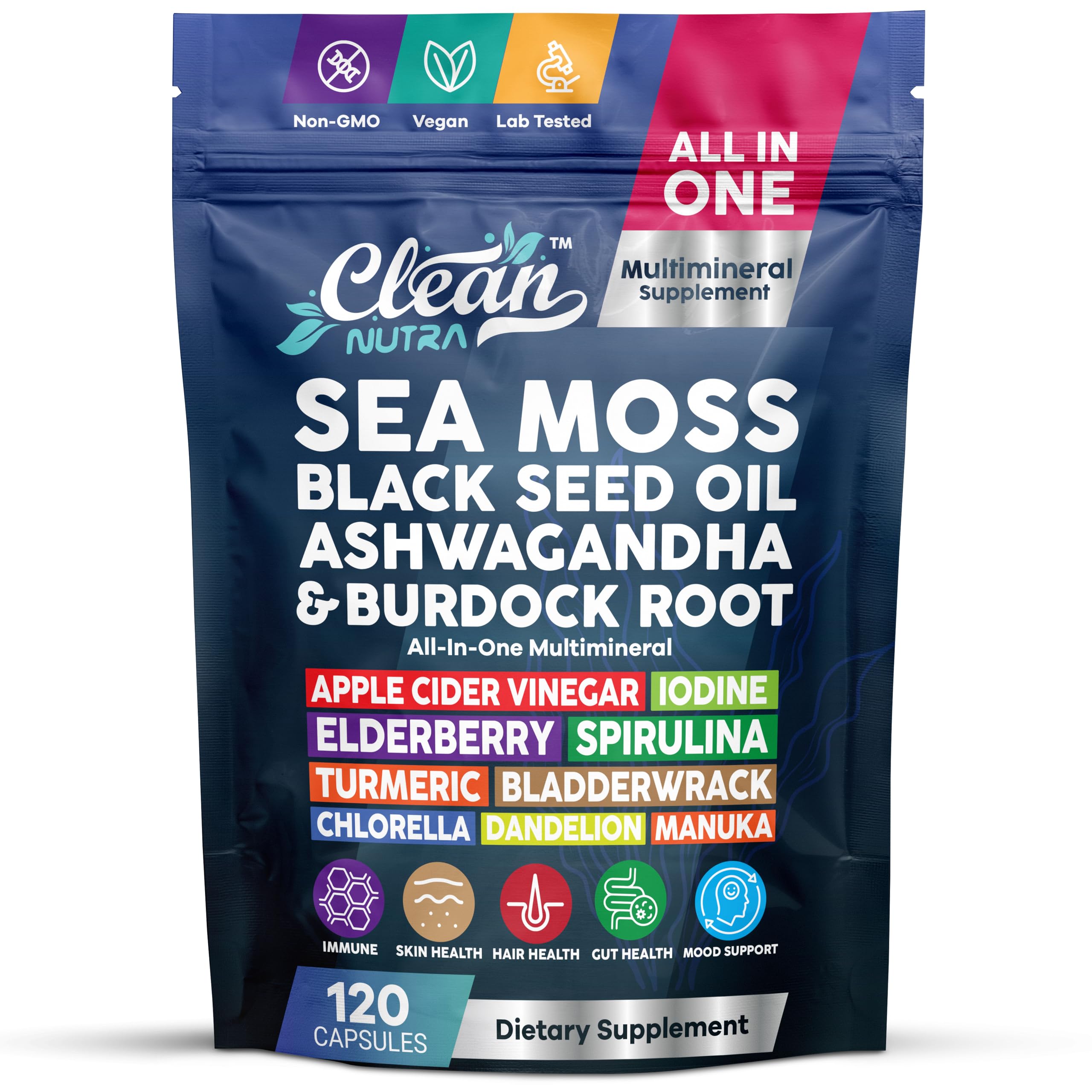 The Raw Sea Moss and Black Seed Oil Capsules You’ve Been Looking For - Clean Nutra's MultiMineral provides 6 full-dose products in one, containing a full Irish Sea Moss Powder, Black Seed Powder, Ashwagandha Extract, Bladderwrack Powder, and Burdock Root Powder in a convenient all in one supplement! Finally, irish sea moss wildcrafted, black seed, ashwagandha powder, bladderwrack herb and burdock root pills have been packed into one convenient solution that's quick and easy to take.