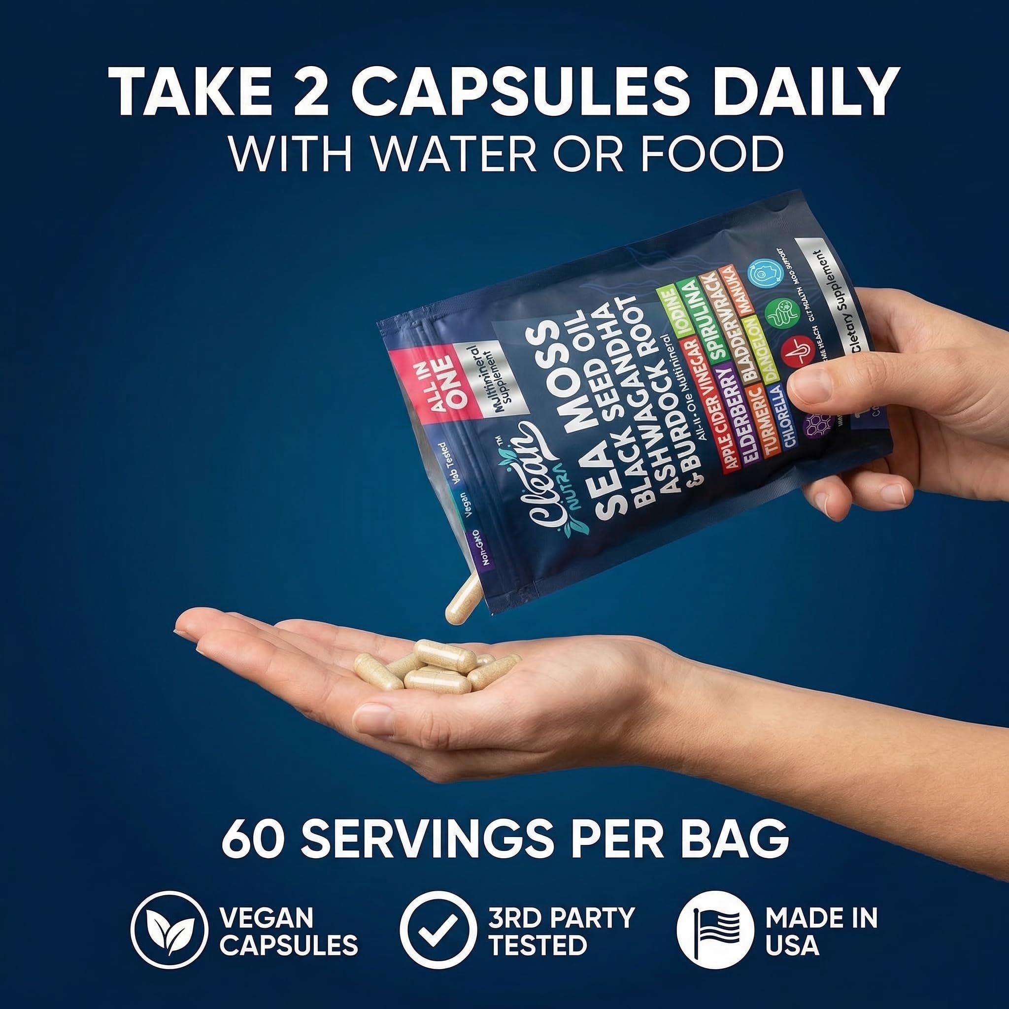 Clean Nutra Irish Sea Moss Capsules For Women and Men - Our Seamoss Pills and Black Seed Oil for hair includes 15 ingredients such as Turmeric Curcumin Capsules, Bladderwrack capsules, Burdock roots, Chlorophyll and more! Sea Moss capsules with black seed have been combined and the results are amazing. Clean Nutraceuticals has officially created the world’s most inclusive 15 in 1 raw sea moss, black seed capsules, ashwagandha extract, bladderwrack root, Burdock roots, turmeric curcumin capsules.