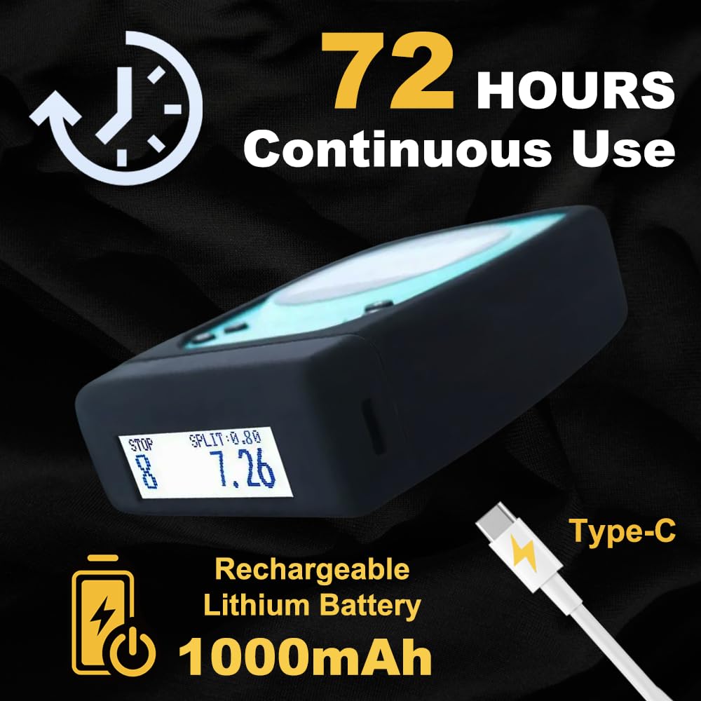 Super Battery Life: Extra-large battery capacity, charges with a USB-C cable, can work 72 hours of continuous operation on a full charge. The shot timer will automatically shut down after 5 minutes of non-operation to conserve power