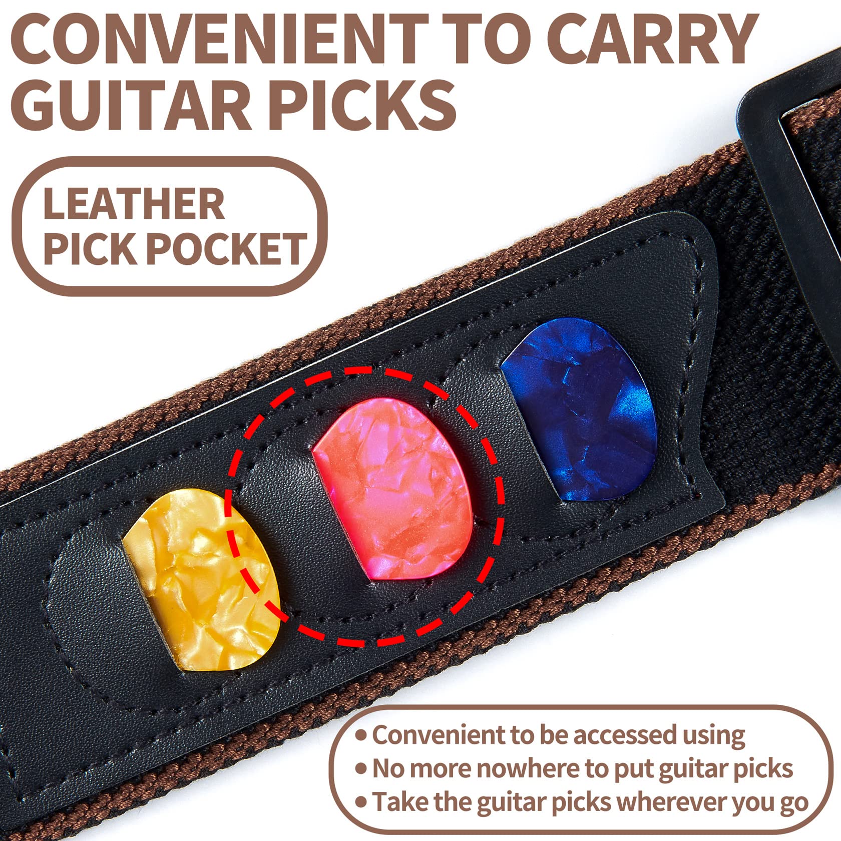 【SIMPLE & ELEGANT DESIGN】The amazing guitar strap features simple and elegant black color and the edges are woven in brown that would work for all guitar styles, simple, basic and classic.