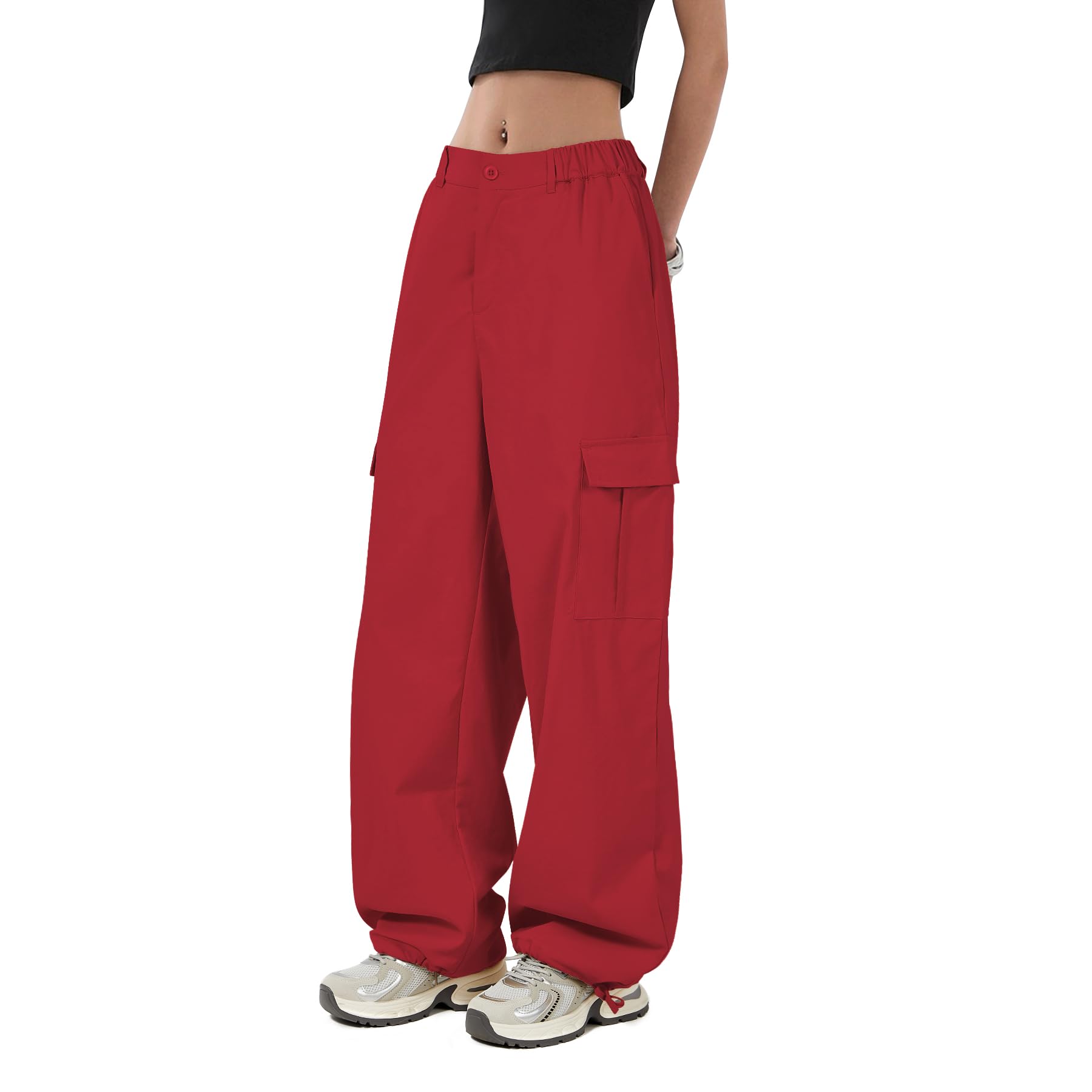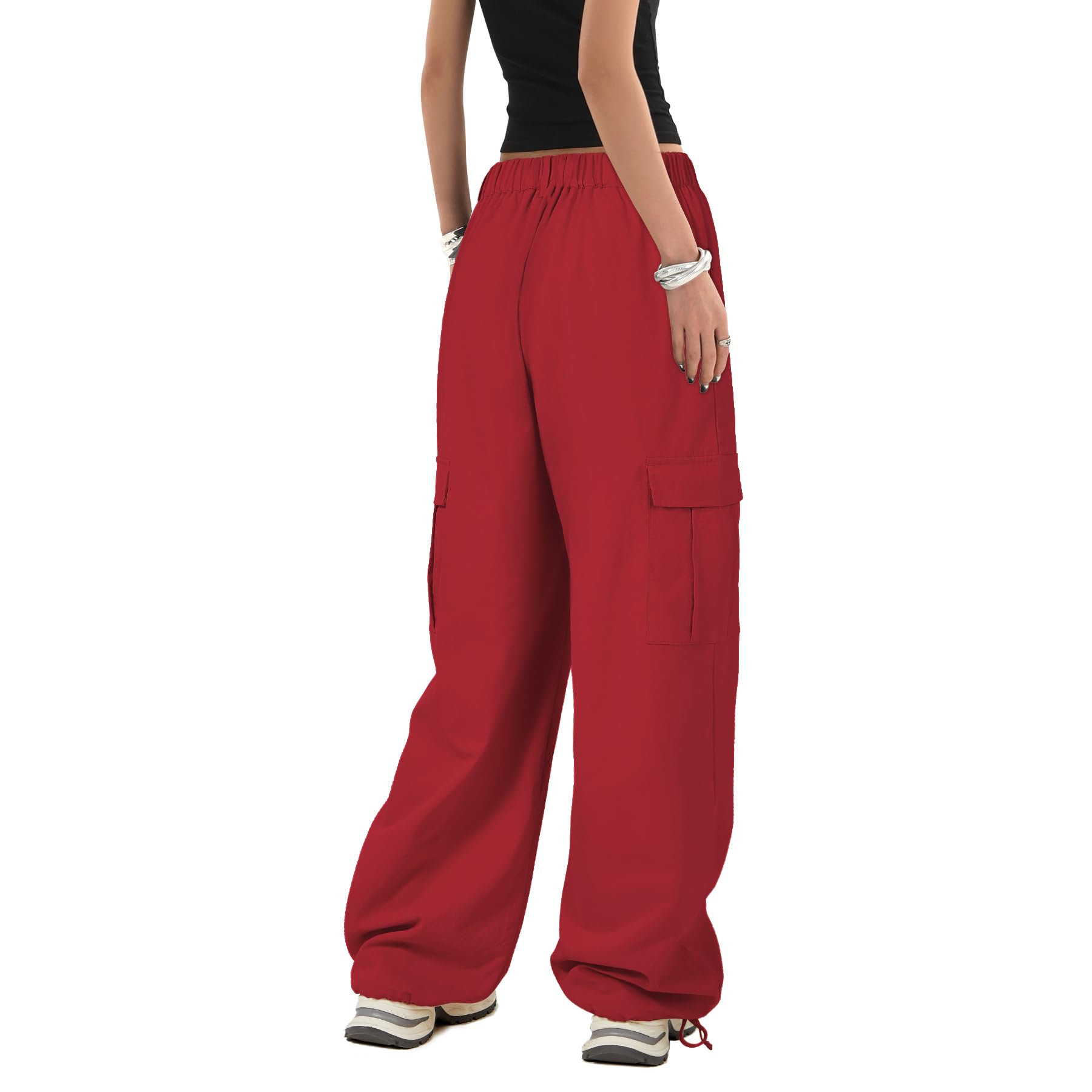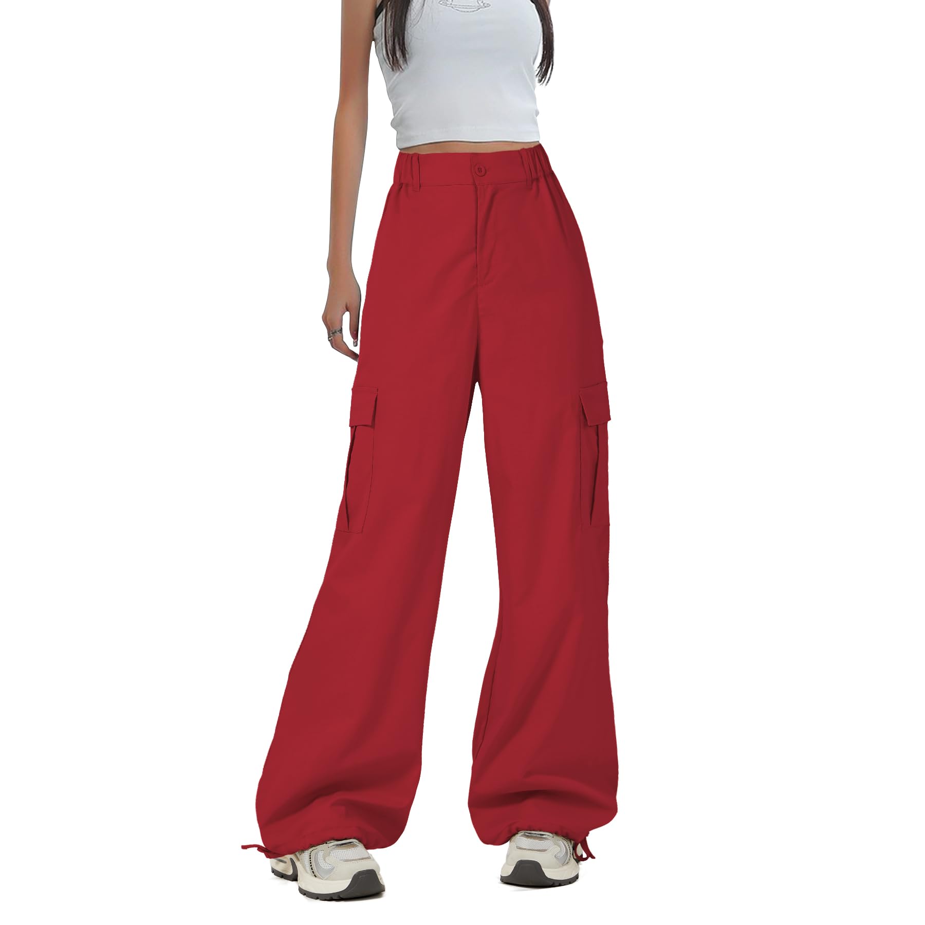 Baggy Parachute Pants : The white cargo pants are slightly sheer, opt for black if you prefer. Size S gives a relaxed fit—petite or slim girls should consider sizing carefully. For the model's look in size M, we recommend sizing up. These women's loose high-waist cargo pants feature an elasticized waistband, flattering all body types. Adjustable drawstrings at the hem offer two styling options, creating versatile Y2K-inspired streetwear vibes.
