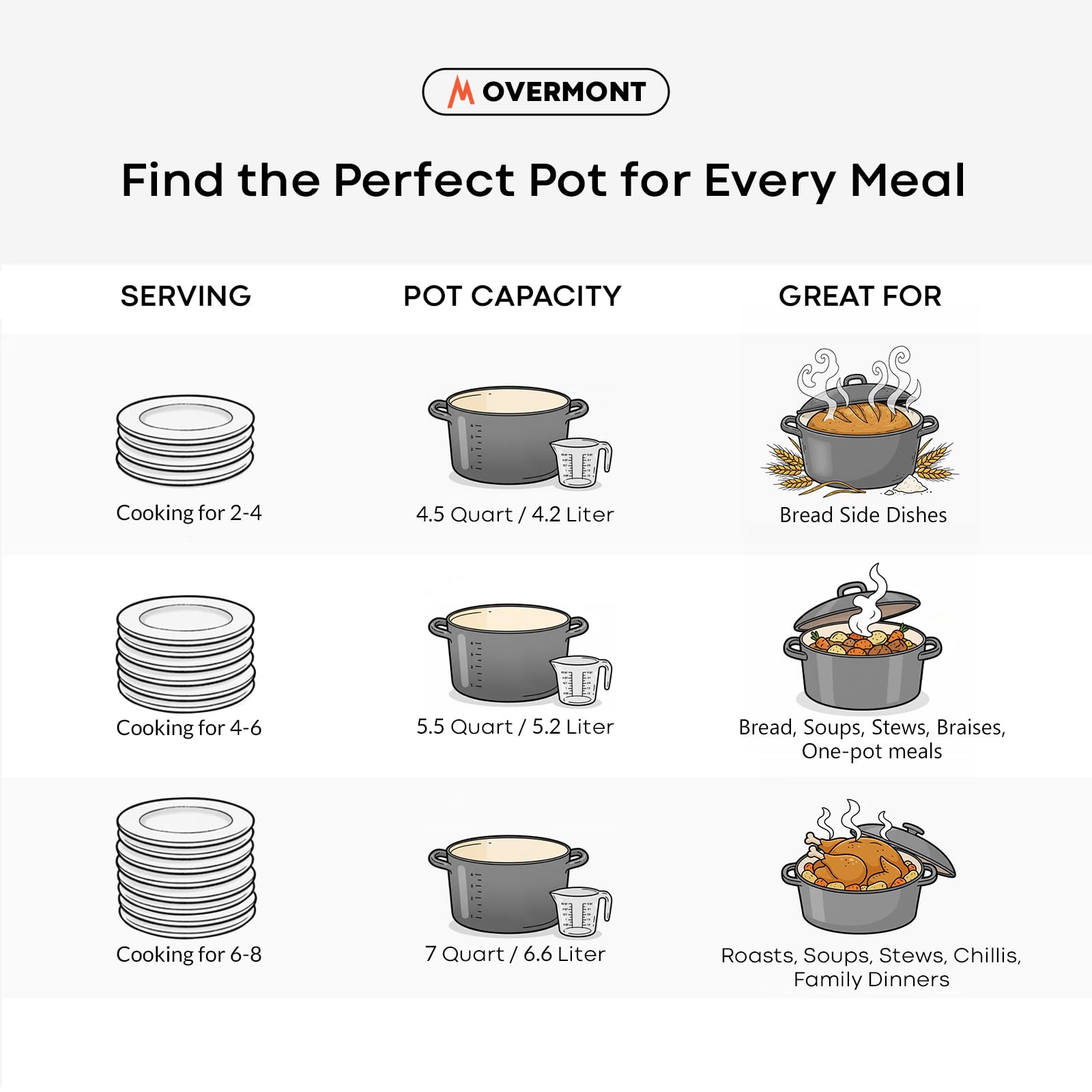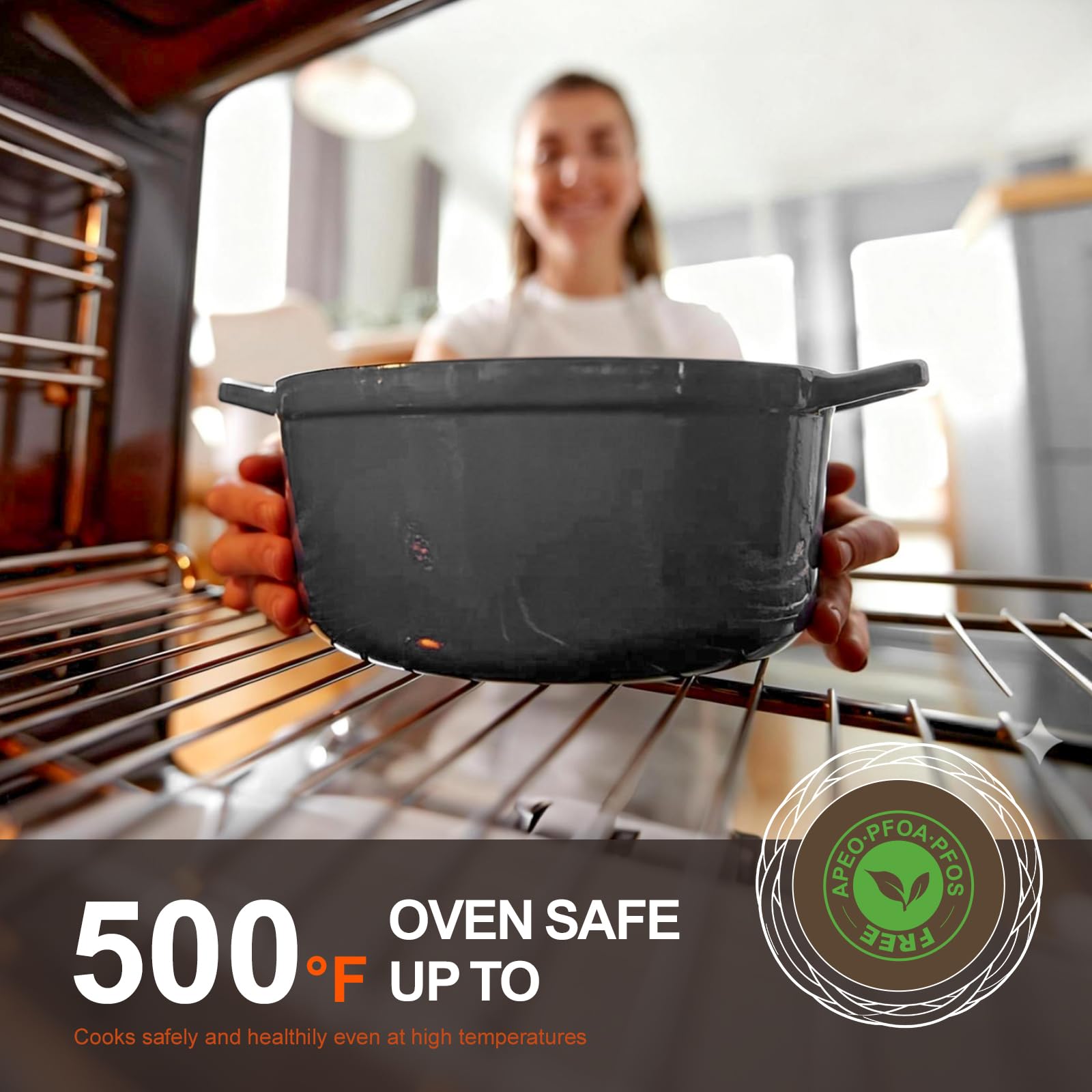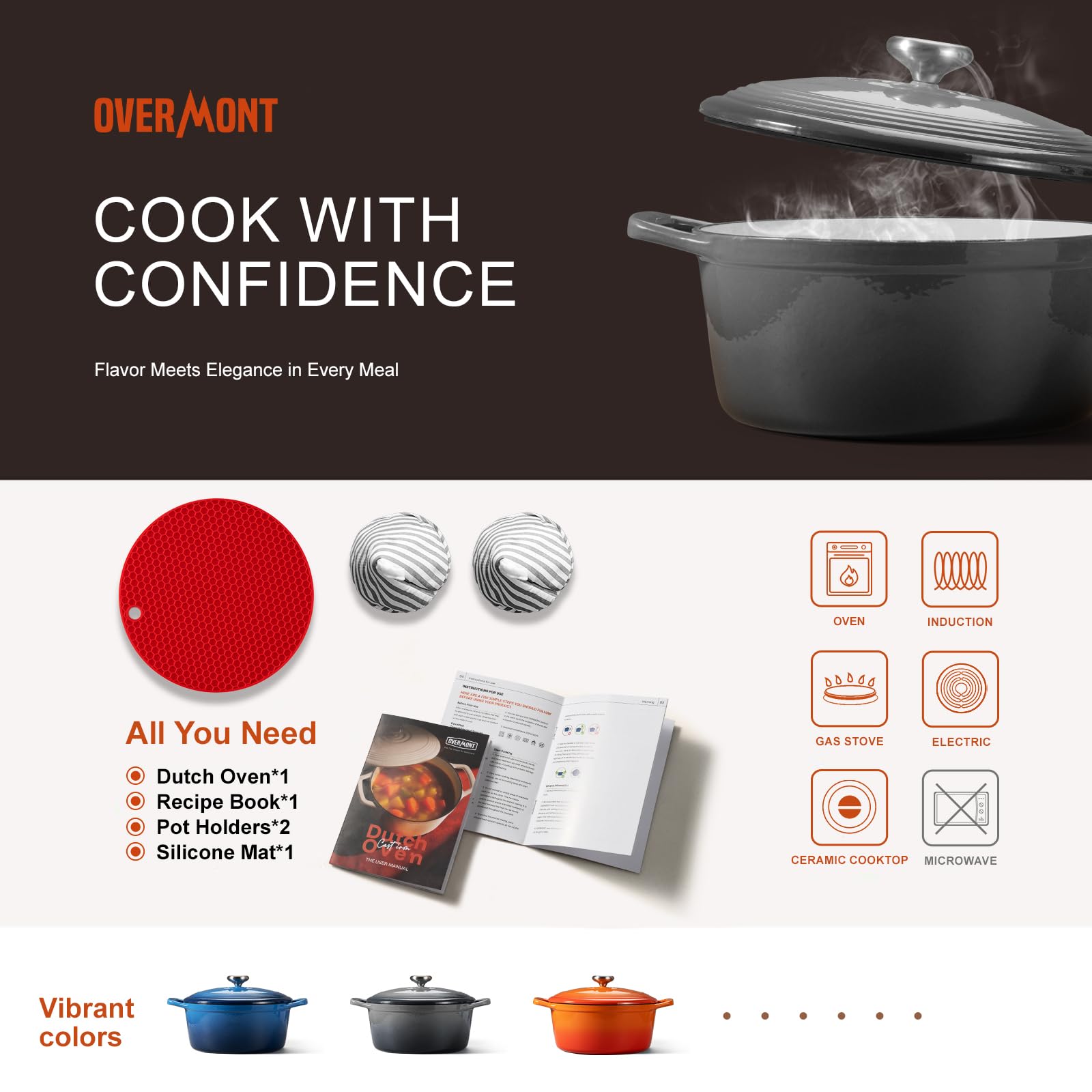 【Universal Compatibility】Our premium enamel Dutch oven is designed to shine on various stovetops, including gas, electric and ceramic. Plus, it's oven safe up to 500℉, offering an exceptional range of cooking options. From stewing to roasting, this Overmont upgraded Dutch oven can handle it all.