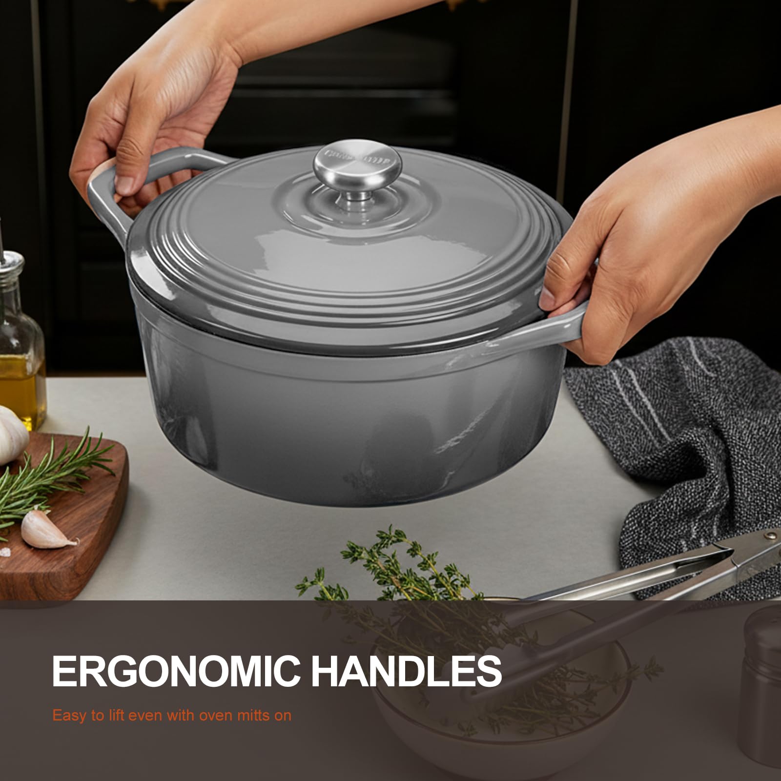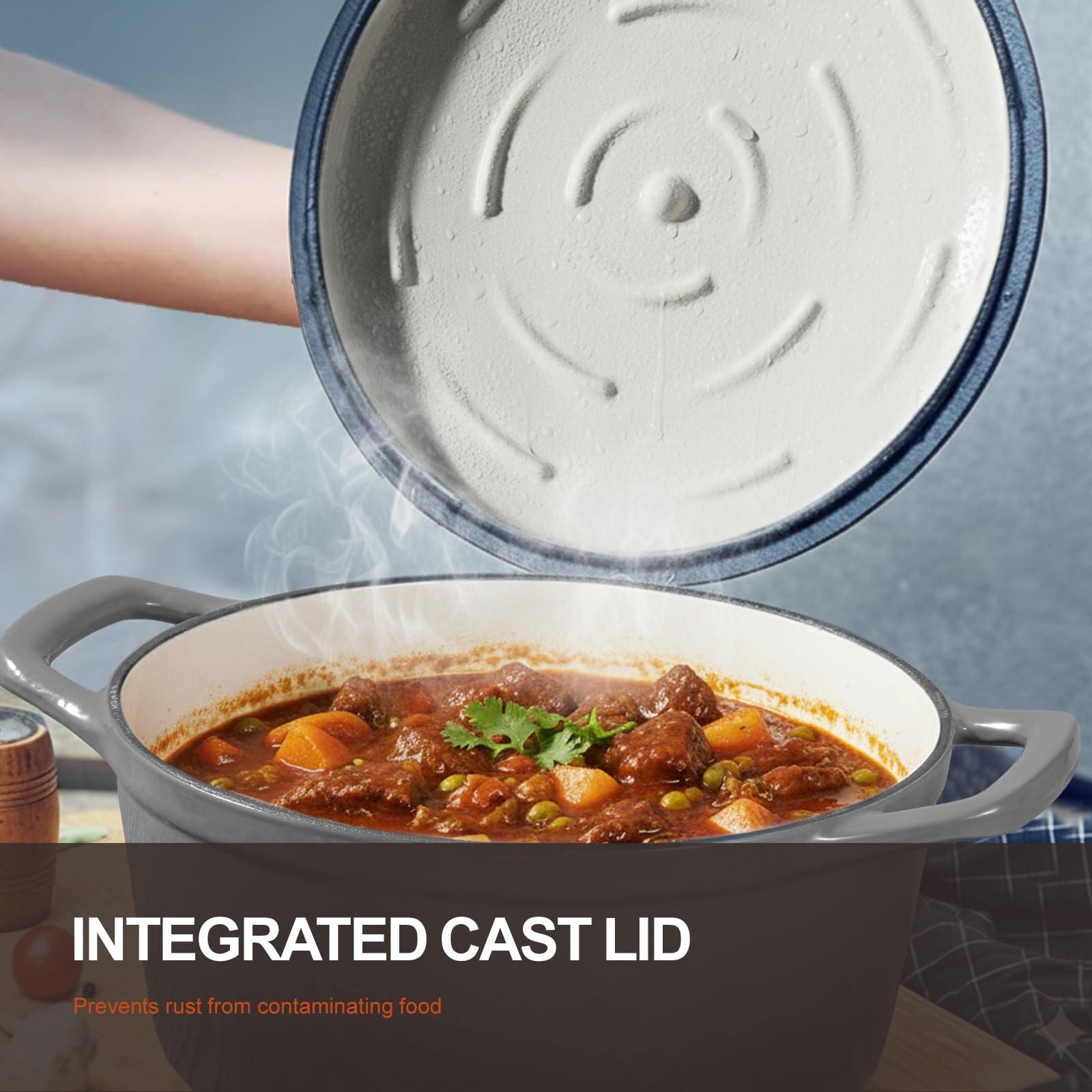 【Outstanding Heat Distribution & Exceptional Heat Retention】Heavy-duty enamel cast iron ensures even heat distribution and exceptional heat retention. Its sturdy, one-piece construction guarantees unmatched durability, providing a seamless cooking experience. The upgraded arched lid creates natural micro-pressure for efficient, flavor-locked cooking. 𝐍𝐎𝐓𝐄: 𝐅𝐨𝐫 𝐛𝐞𝐬𝐭 𝐫𝐞𝐬𝐮𝐥𝐭𝐬 𝐨𝐧 𝐭𝐡𝐞 𝐬𝐭𝐨𝐯𝐞𝐭𝐨𝐩, 𝐮𝐬𝐞 𝐦𝐞𝐝𝐢𝐮𝐦 𝐭𝐨 𝐥𝐨𝐰 𝐡𝐞𝐚𝐭 𝐭𝐨 𝐩𝐫𝐞𝐯𝐞𝐧𝐭 𝐟𝐨𝐨𝐝 𝐟𝐫𝐨𝐦 𝐬𝐭𝐢𝐜𝐤𝐢𝐧𝐠 𝐝𝐮𝐫𝐢𝐧𝐠 𝐮𝐬𝐞.
