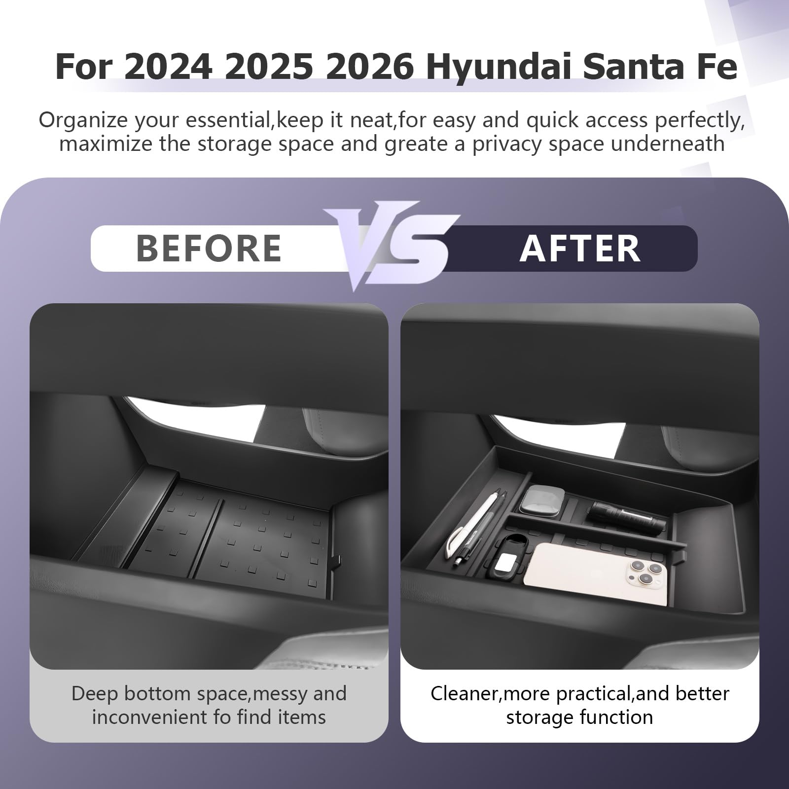 Tool-Free Installation — Easily disassemble the 2025 Santa Fe accessories,car center console storage box, and directly insert the 2025 Santa Fe armrest console organizer into the center console, without modification, no cutting/tools. The 2026 Santa Fe center console organizer overall texture structure can be well integrated with the shift console, without abrupt display