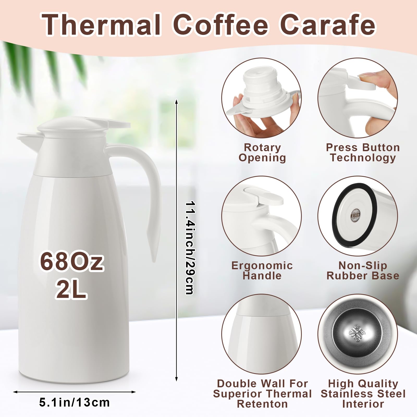 Proper Capacity: the vacuum insulated thermal coffee carafe measures about 68 oz in capacity, ideal size for holding tea, coffee, milk, water, juices, and other cold or hot drinks; With a nonslip silicone base, it can keep stable on your table or countertop