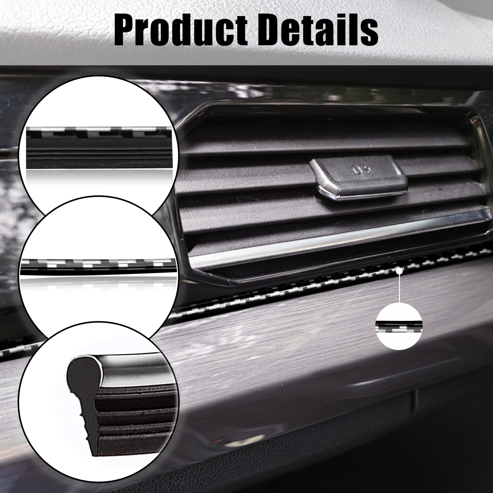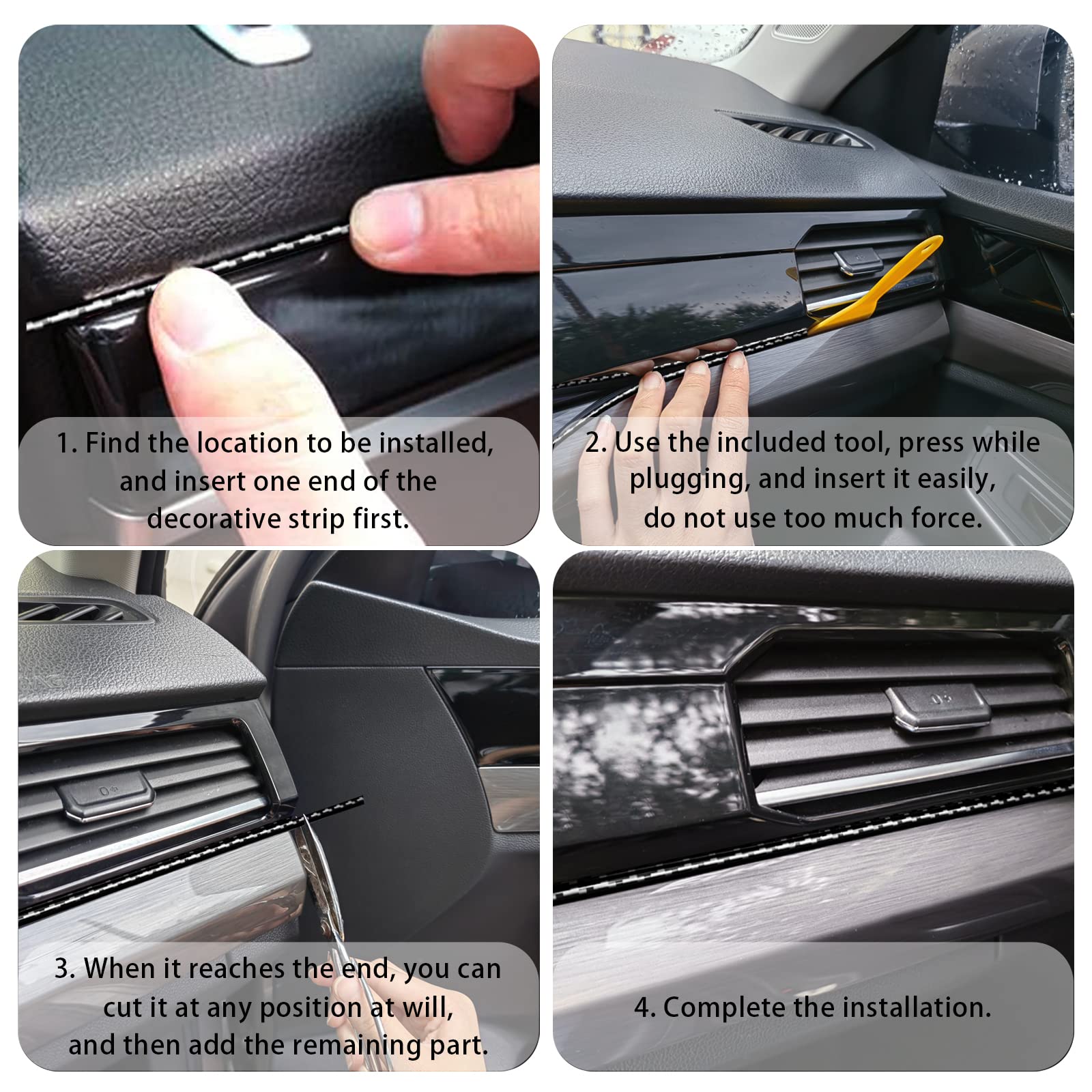 Interior Strip Size: The length of the trim strip is 10 meters, about 33feet, which is enough to use in your car interior, dashboard, door, steering wheel, center console, etc. Also easy to trim to the right length you need.