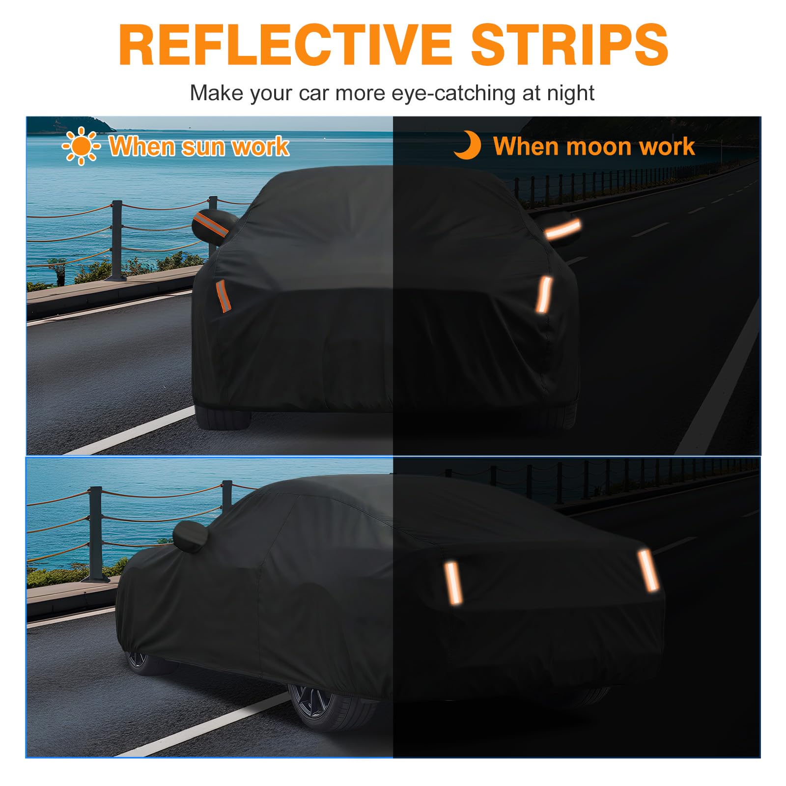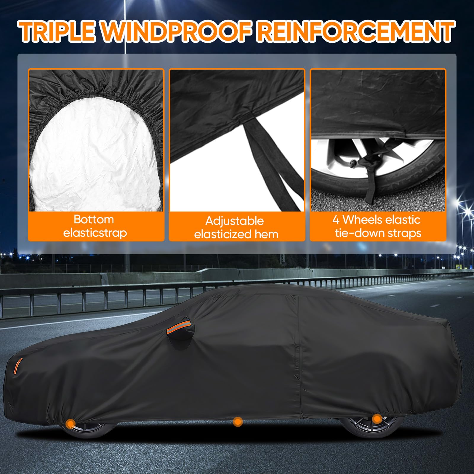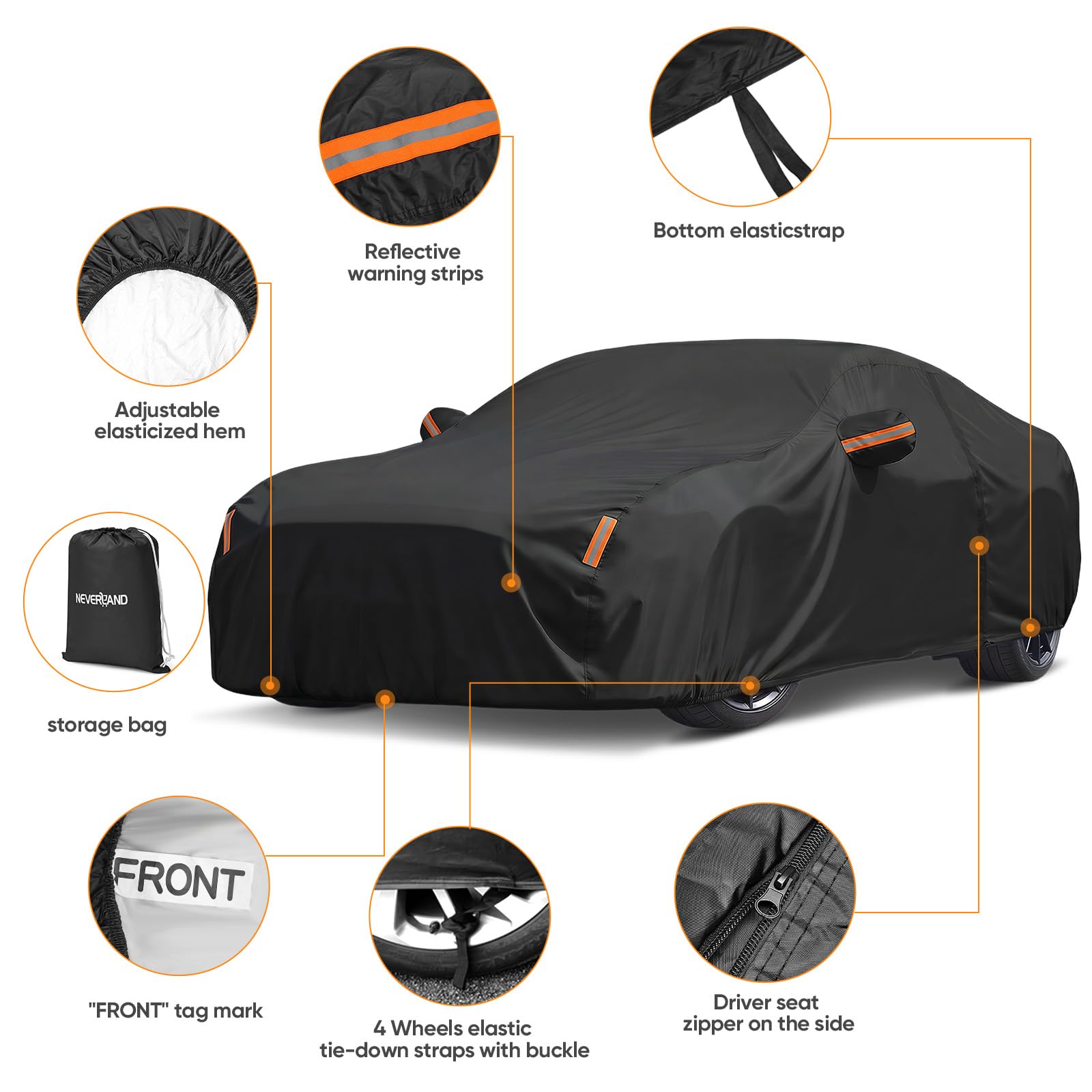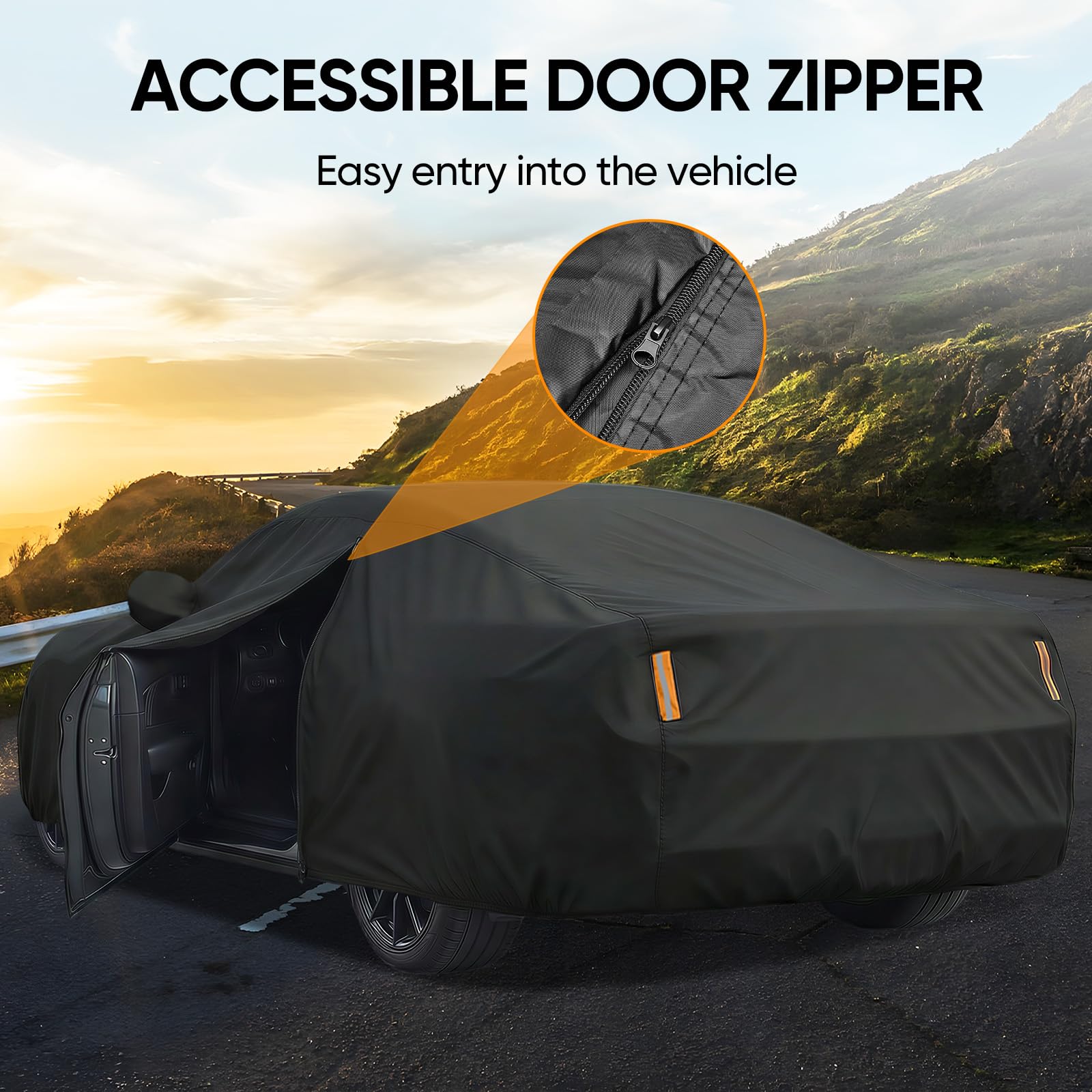 Driver Door Zipper ,Elastic Hem Type & Wheel Fixing Strap: 1)Driver Door Zipper for Easy Access. 2) All four tires can be fixed to Protect Your Auto Cover not Blown Away by Heavy Wind. 4) Reflective Stripes Make you car stay in safe